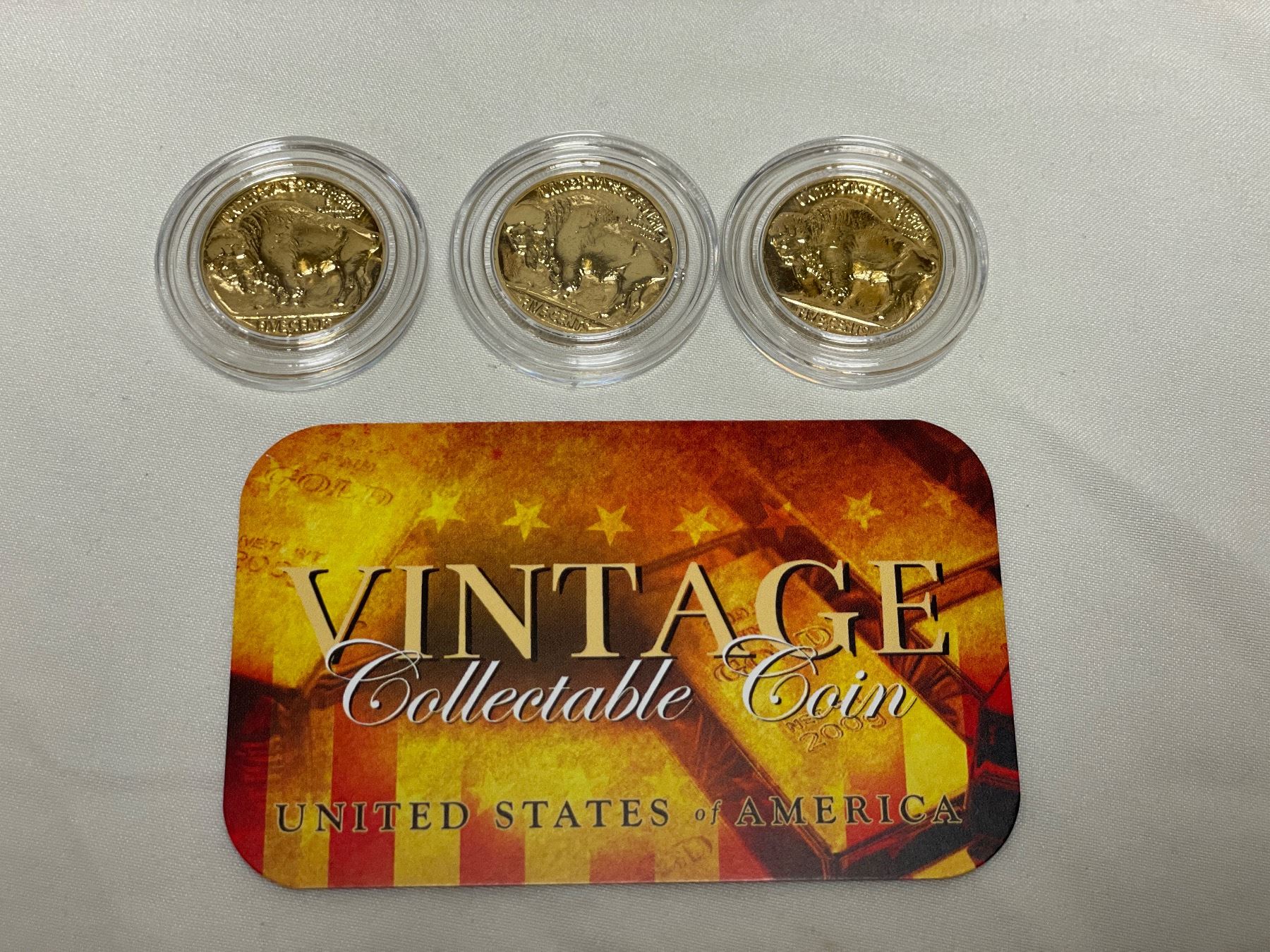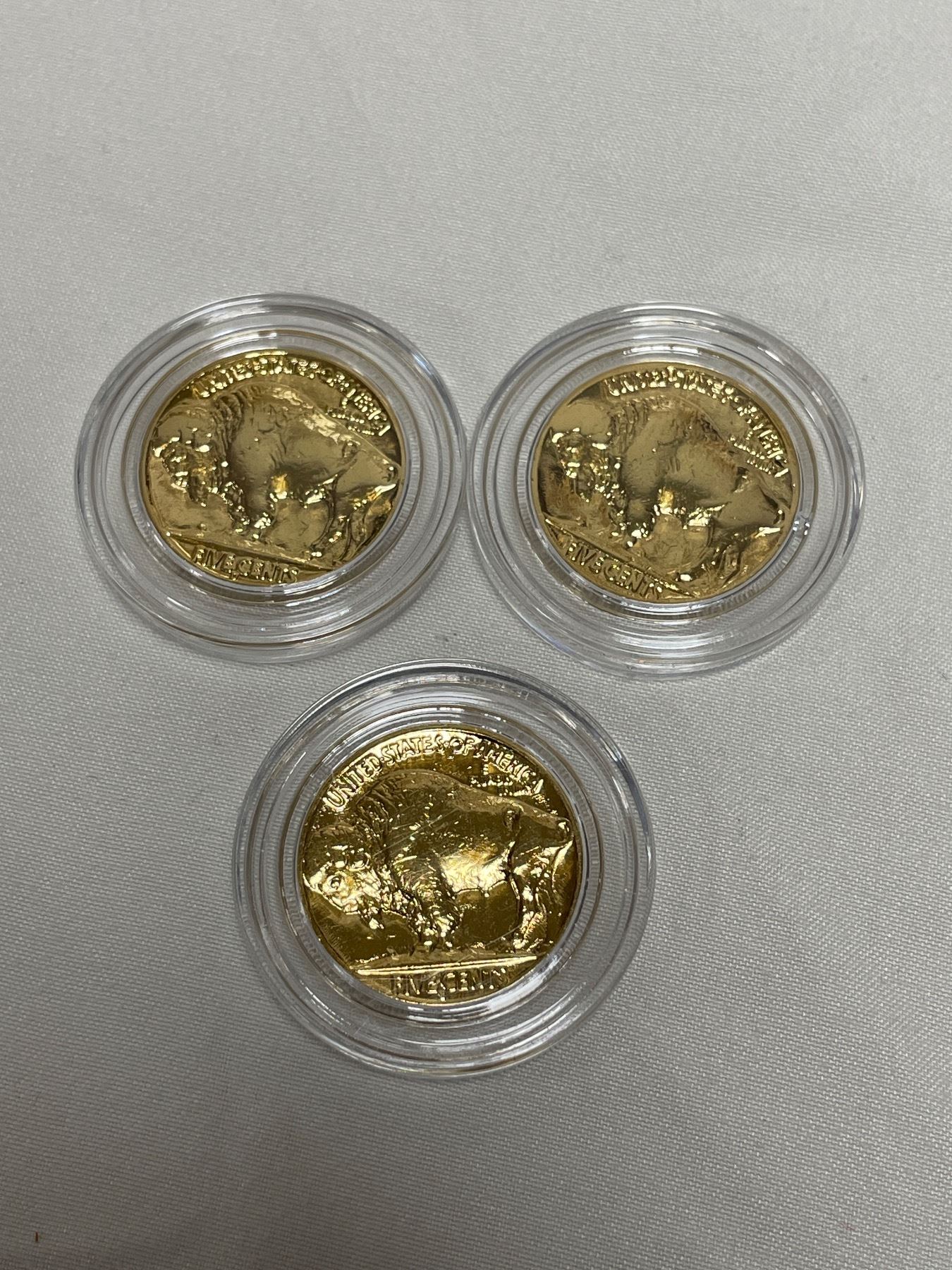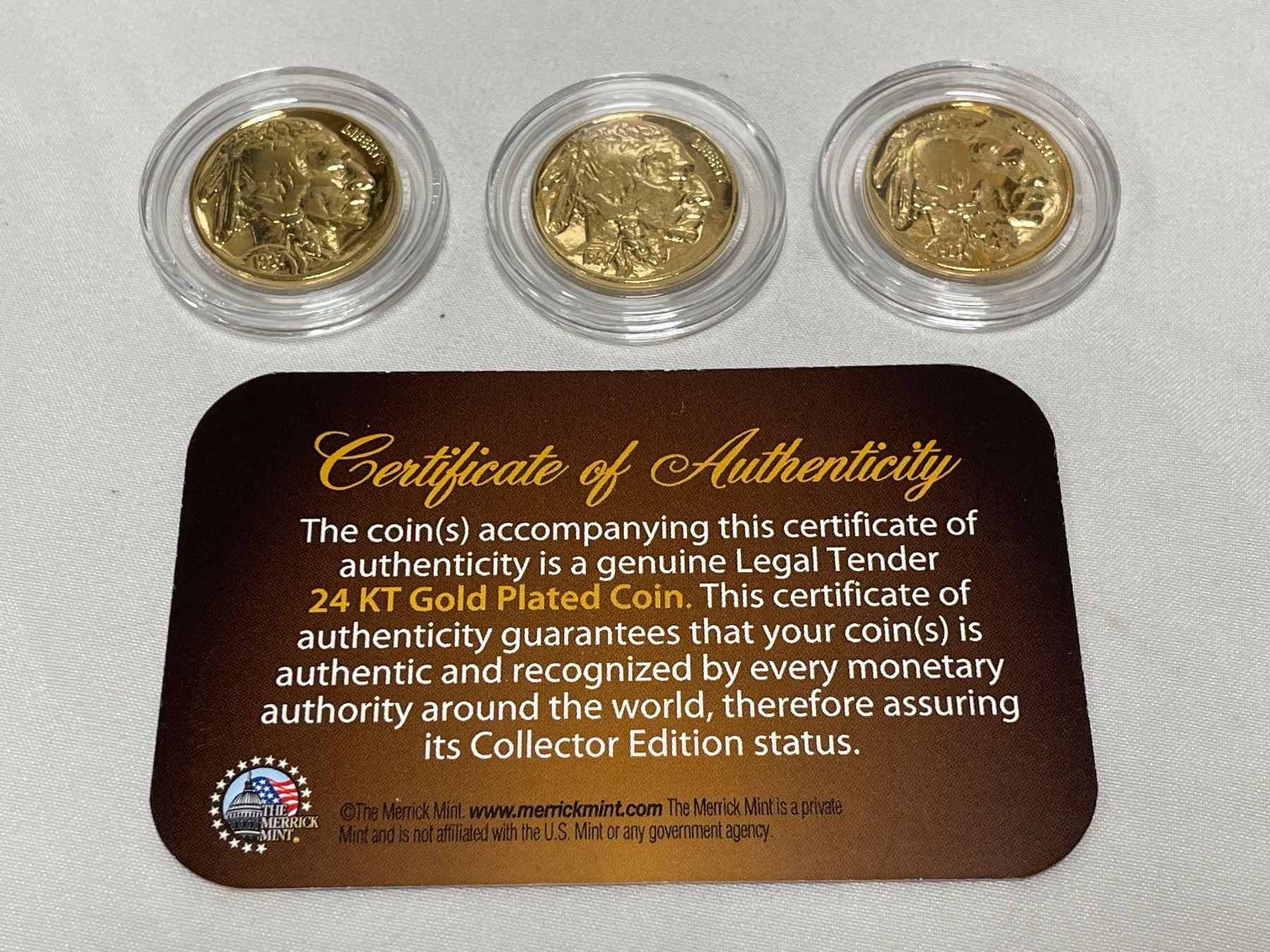 3 24Kt Gold Plated 5 Cent Buffalo Coins With Coa
