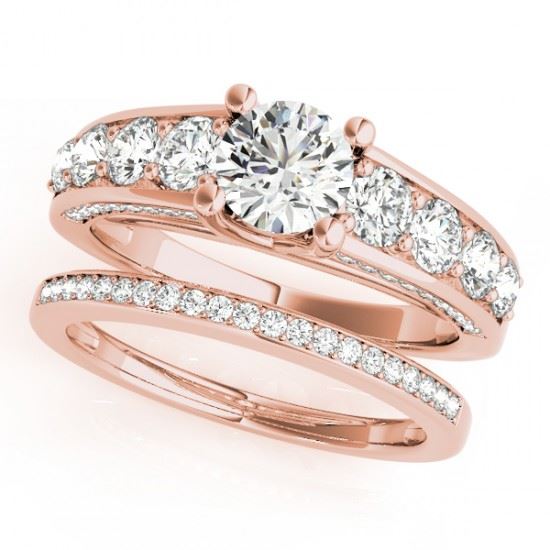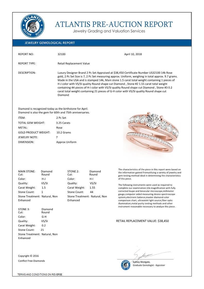 REF-640H5A -32100 ---- 3.25 CTW Certified VS/SI Diamond 2Pc Set Solitaire Wedding 14K Rose Gold ---- Luxury Designer Brand 2 Pc Set Appraised at $38,450 Certificate Number US32100 14k Rose gold, 2 Pc Set Size is 7, 2 Pc Set measuring approx. Uniform, weighing in total approx. 9.7 grams. Made in the USA and is stamped 14k, Main stone 1.5 carat total weight containing 1 pieces of H-J color with VS/SI quality Round shape cut Diamond , Stone #2 1.55 carat total weight containing 44 pieces of H-I color with VS/SI quality Round shape cut Diamond , Stone #3 0.2 carat total weight containing 21 pieces of G-H color with VS/SI quality Round shape cut Diamond