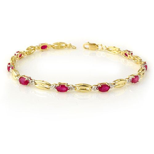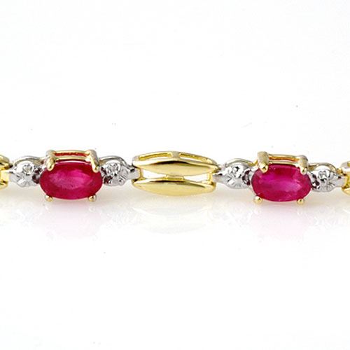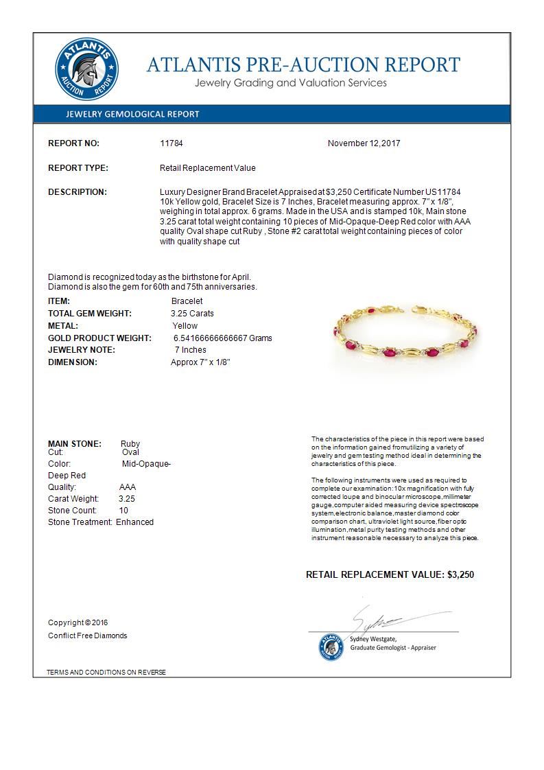 REF-45H5A -11784 ---- 3.25 CTW Ruby Bracelet 10K Yellow Gold ---- Luxury Designer Brand Bracelet Appraised at $3,250 Certificate Number US11784 10k Yellow gold, Bracelet Size is 7 Inches, Bracelet measuring approx. 7" x 1/8", weighing in total approx. 6 grams. Made in the USA and is stamped 10k, Main stone 3.25 carat total weight containing 10 pieces of Mid-Opaque-Deep Red color with AAA quality Oval shape cut Ruby , Stone #2 carat total weight containing pieces of color with quality shape cut
