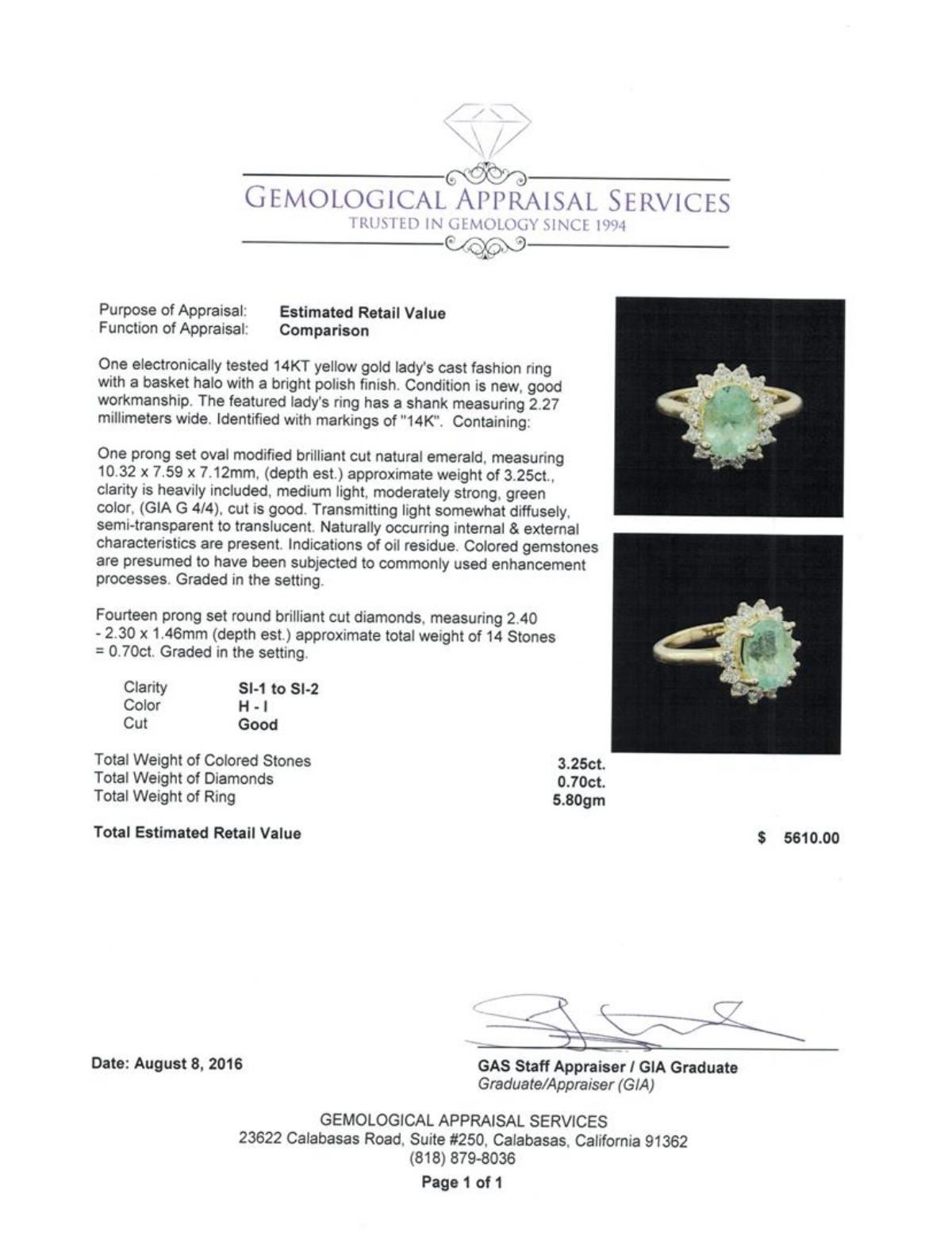 One electronically tested 14KT yellow gold lady's cast fashion ring with a basket halo with a bright polish finish. The featured lady's ring has a shank measuring 2.27 millimeters wide. Identified with markings of '14K'. Condition is new, good workmanship. Containing: One prong set oval modified brilliant cut natural emerald, measuring 10.32 x 7.59 x 7.12mm, (depth est.) approximate weight of 3.25ct., clarity is heavily included, medium light, moderately strong, green color, (GIA G 4/4), cut is good. Transmitting light somewhat diffusely, semi-transparent to translucent. Naturally occurring internal & external characteristics are present. Indications of oil residue. Colored gemstones are presumed to have been subjected to commonly used enhancement processes. Graded in the setting. Fourteen prong set round brilliant cut diamonds, measuring 2.40 - 2.30 x 1.46mm (depth est.) approximate total weight of 14 Stones = 0.70ct. Graded in the setting. Clarity SI-1 to SI-2. Color: H - I Cut Good. Total Weight of Colored Stones 3.25ct.. Total Weight of Diamonds 0.70ct.. Total Weight of Ring 5.80gm. GAS Appraised.