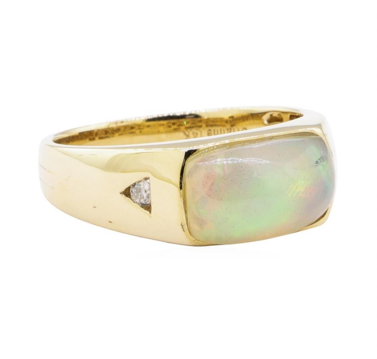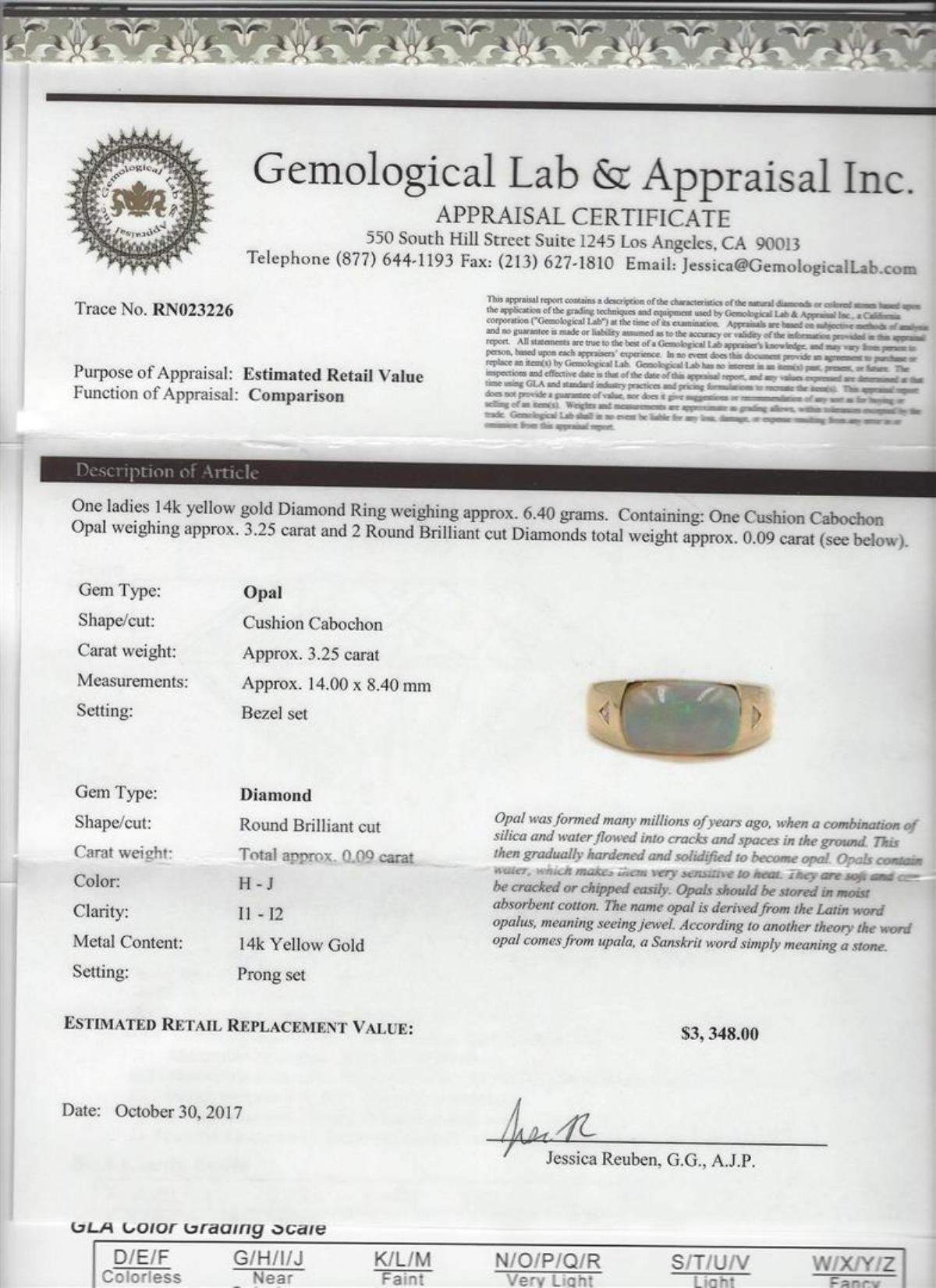 One ladies 14k yellow gold Diamond Ring weighing approx. 6.40 grams. Containing: One Cushion Cabochon Opal Weighing approx. 3.25 carat and 2 Round Brilliant cut Diamonds total weight approx. 0.09 carat. Gem Type: Opal Shape/cut: Cushion Cabochon Carat weight: Approx. 3.25 carat Measurements: Approx. 14.00 x 8.40 mm Setting: Bezel set Gem Type: Diamond Shape/cut: Round Brilliant cut Carat weight Total approx. 0.09 carat Color: H - J Clarity: I1 - I2 Metal Content: 14k Yellow Gold Setting: Prong set ESTIMATED RETAIL REPLACEMENT VALUE: $3, 348.00 US