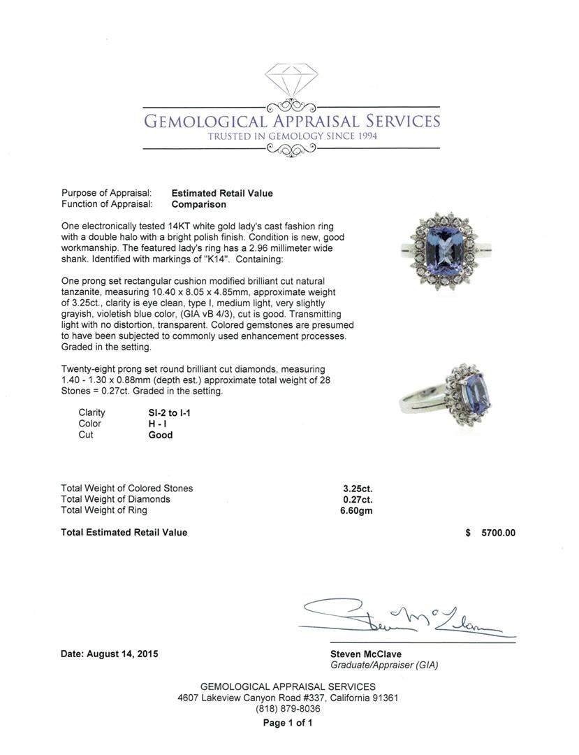 One electronically tested 14KT white gold lady's cast fashion ring with a double halo with a bright polish finish. The featured lady's ring has a 2.96 millimeter wide shank. Identified with markings of "K14". Condition is new, good workmanship. Containing: One prong set rectangular cushion modified brilliant cut natural tanzanite, measuring 10.40 x 8.05 x 4.85mm, approximate weight of 3.25ct., clarity is eye clean, type I, medium light, very slightly grayish, violetish blue color, (GIA vB 4/3), cut is good. Transmitting light with no distortion, transparent. Colored gemstones are presumed to have been subjected to commonly used enhancement processes. Graded in the setting. Twenty-Eight prong set round brilliant cut diamonds, measuring 1.40 - 1.30 x 0.88mm (depth est.) approximate total weight of 28 Stones = 0.27ct. Graded in the setting. Clarity: SI-2 to I-1. Color: H - I. Cut Good. Total Weight of Colored Stones 3.25ct. Total Weight of Diamonds 0.27ct. Total Weight of Ring 6.60gm. GAS Appraised at $5,700.00.
