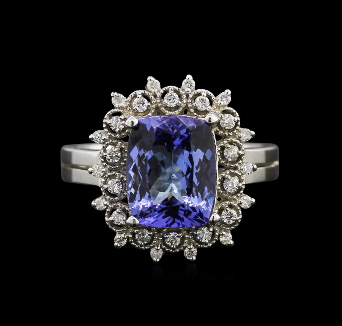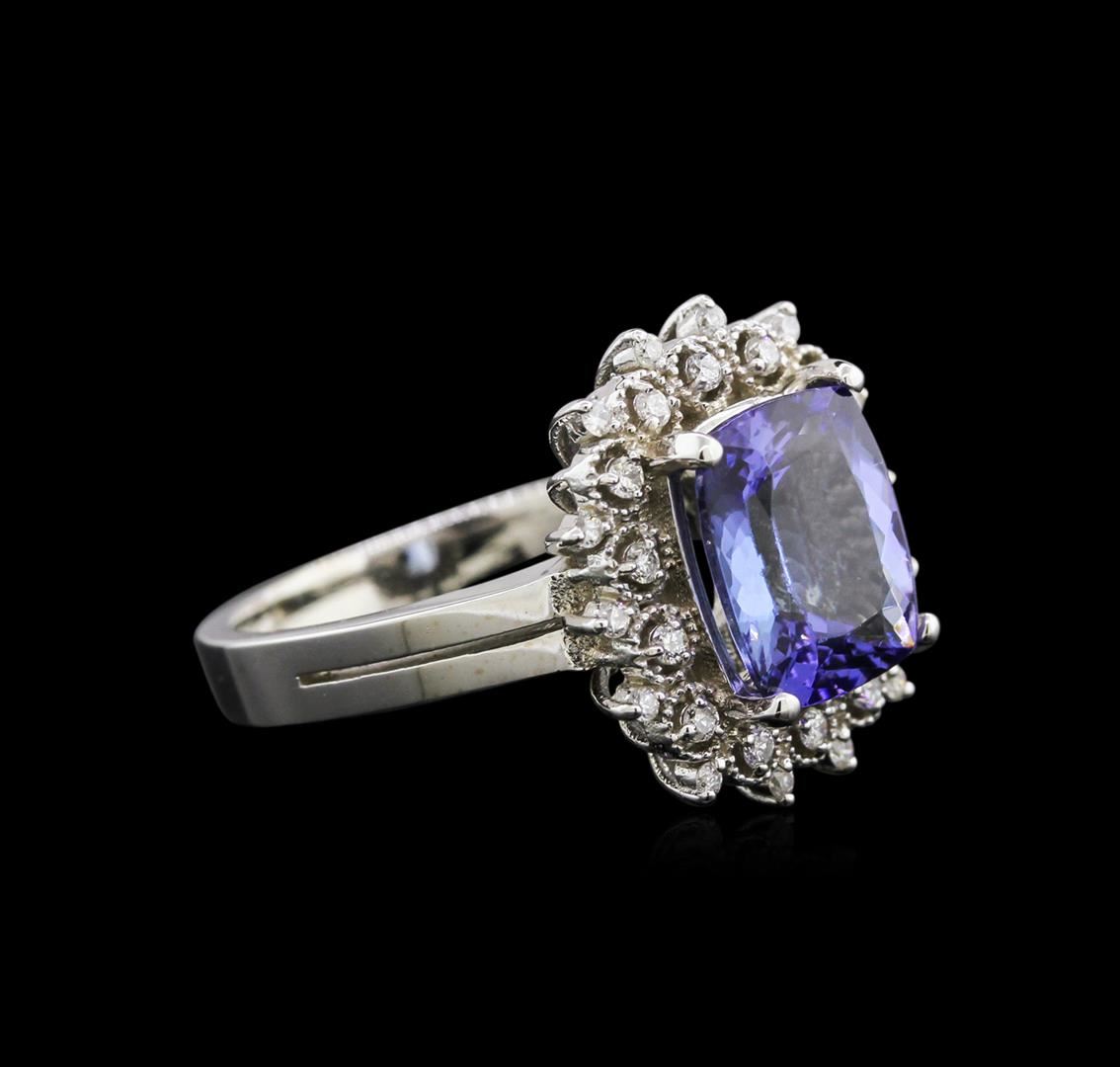 One electronically tested 14KT white gold lady's cast fashion ring with a double halo with a bright polish finish. The featured lady's ring has a 2.96 millimeter wide shank. Identified with markings of "K14". Condition is new, good workmanship. Containing: One prong set rectangular cushion modified brilliant cut natural tanzanite, measuring 10.40 x 8.05 x 4.85mm, approximate weight of 3.25ct., clarity is eye clean, type I, medium light, very slightly grayish, violetish blue color, (GIA vB 4/3), cut is good. Transmitting light with no distortion, transparent. Colored gemstones are presumed to have been subjected to commonly used enhancement processes. Graded in the setting. Twenty-Eight prong set round brilliant cut diamonds, measuring 1.40 - 1.30 x 0.88mm (depth est.) approximate total weight of 28 Stones = 0.27ct. Graded in the setting. Clarity: SI-2 to I-1. Color: H - I. Cut Good. Total Weight of Colored Stones 3.25ct. Total Weight of Diamonds 0.27ct. Total Weight of Ring 6.60gm. GAS Appraised at $5,700.00.