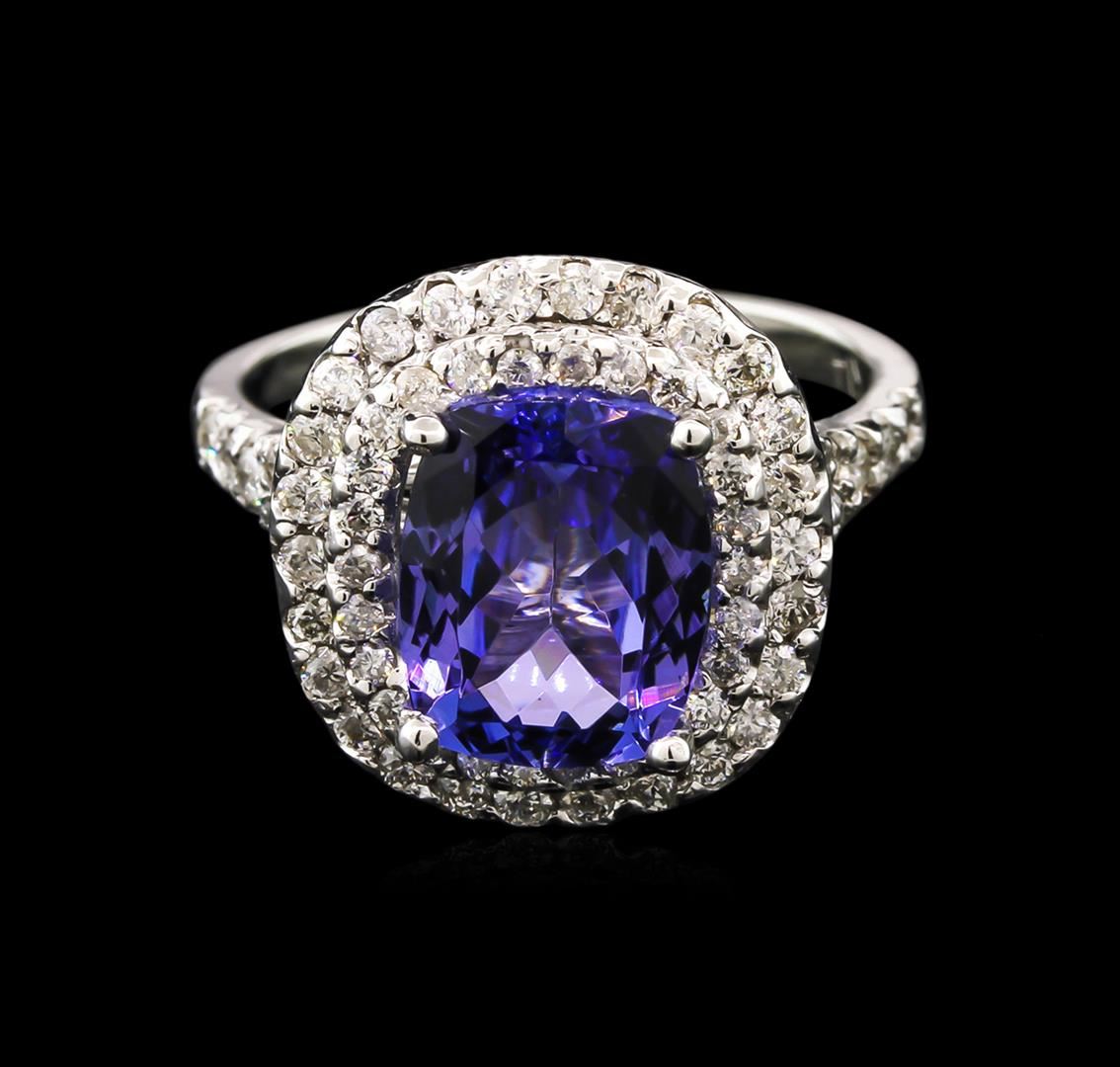 One electronically tested 14KT white gold lady's cast fashion ring with a double halo with a bright polish finish. The featured lady's ring has a shank measuring 1.80 millimeters wide. Identified with markings of "K14". Condition is new, good workmanship. Containing: One prong set rectangular cushion modified brilliant cut natural tanzanite, measuring 9.92 x 7.97 x 4.79mm, 9% bulge factor, approximate weight of 3.25ct., clarity is eye clean, type I, medium, very slightly grayish, bluish violet color, (GIA bV 5/3), cut is good. Transmitting light with no distortion, transparent. Colored gemstones are presumed to have been subjected to commonly used enhancement processes. Graded in the setting. Thirty-Four prong set round brilliant cut diamonds, measuring 1.40 - 1.30 x 0.81mm (depth est.) approximate total weight of 34 Stones = 0.31ct. Graded in the setting. Clarity: SI-2 to I-1. Color: H - I. Cut Good. Thirty-Two prong set round brilliant cut diamonds, measuring 1.60 - 1.50 x 0.93mm (depth est.) approximate total weight of 32 Stones = 0.44ct. Graded in the setting. Clarity: SI-2 to I-1. Color: H - I. Cut Good. Total Weight of Colored Stones 3.25ct. Total Weight of Diamonds 0.75ct. Total Weight of Ring 5.10gm. GAS Appraised at $7,290.00.