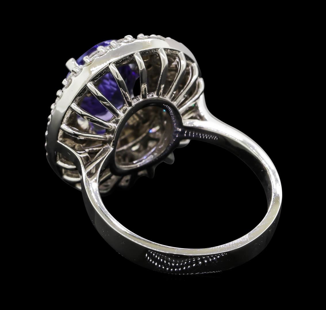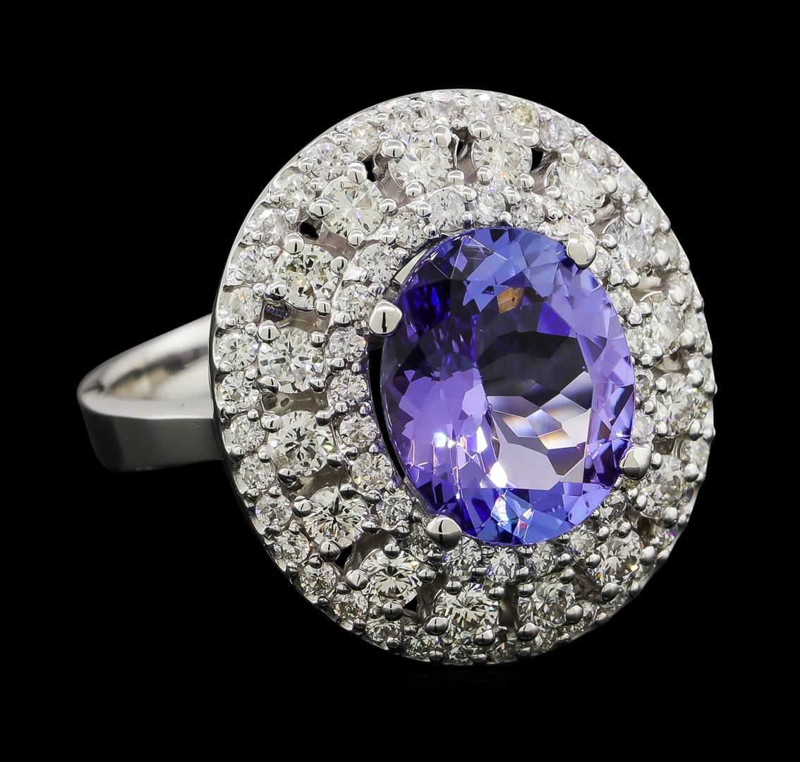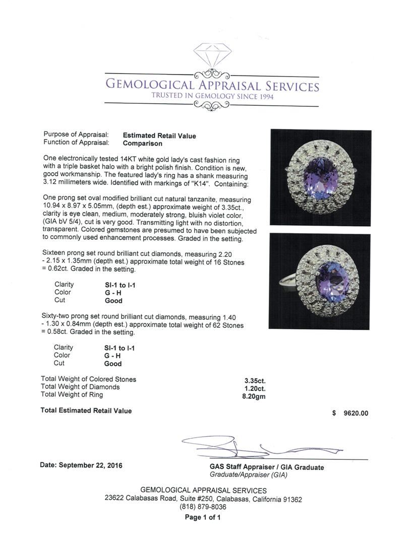 One electronically tested 14KT white gold lady's cast fashion ring with a triple basket halo with a bright polish finish. The featured lady's ring has a shank measuring 3.12 millimeters wide. Identified with markings of 'K14'. Condition is new, good workmanship. Containing: One prong set oval modified brilliant cut natural tanzanite, measuring 10.94 x 8.97 x 5.05mm, (depth est.) approximate weight of 3.35ct., clarity is eye clean, medium, moderately strong, bluish violet color, (GIA bV 5/4), cut is very good. Transmitting light with no distortion, transparent. Colored gemstones are presumed to have been subjected to commonly used enhancement processes. Graded in the setting. Sixteen prong set round brilliant cut diamonds, measuring 2.20 - 2.15 x 1.35mm (depth est.) approximate total weight of 16 Stones = 0.62ct. Graded in the setting. Clarity SI-1 to I-1. Color: G - H Cut Good Sixty-Two prong set round brilliant cut diamonds, measuring 1.40 - 1.30 x 0.84mm (depth est.) approximate total weight of 62 Stones = 0.58ct. Graded in the setting. Clarity SI-1 to I-1. Color: G - H Cut Good. Total Weight of Colored Stones 3.35ct.. Total Weight of Diamonds 1.20ct.. Total Weight of Ring 8.20gm. GAS Appraised at $9,620.00.