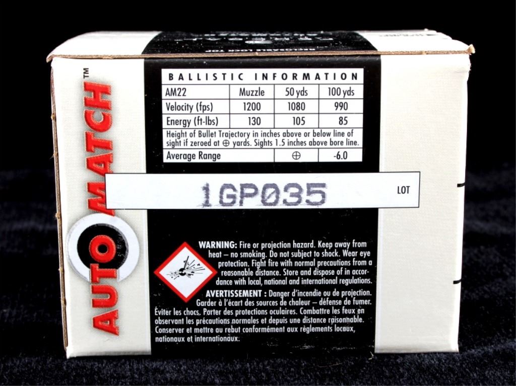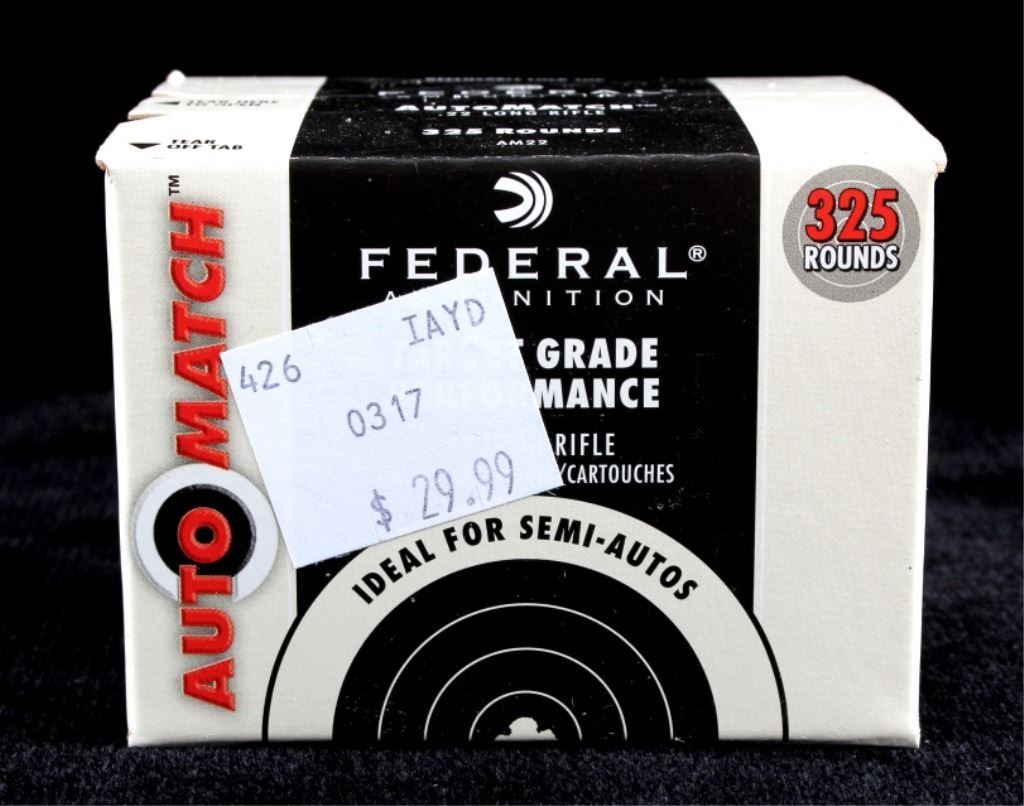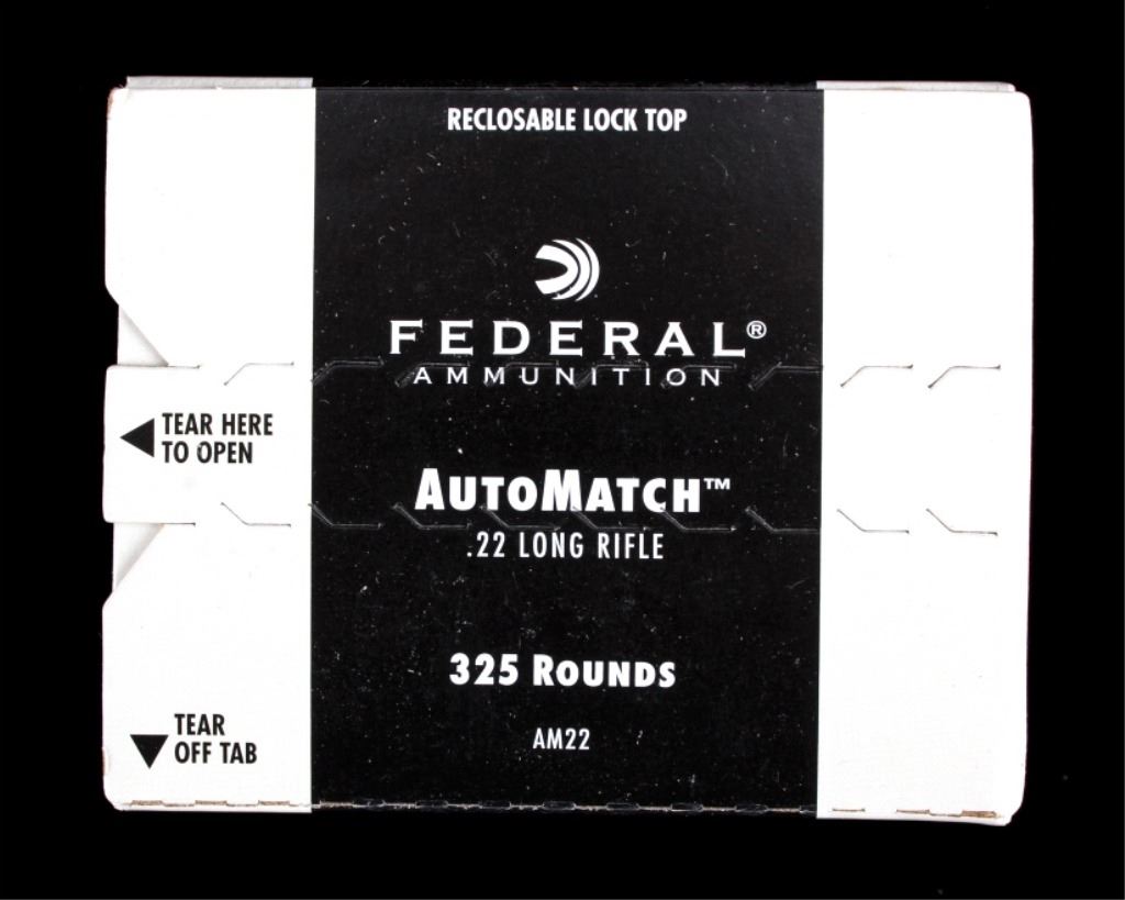 This is a full case of 3,250 rounds of Federal .22LR Automatch ammunition. There are 10 boxes of 325 rounds each. This is target grade ammunition that offers a 40 grain bullet with a muzzle velocity of 1200 fps. Each box is factory sealed in the original case box. The box measures 3" x 8" x 15.25".