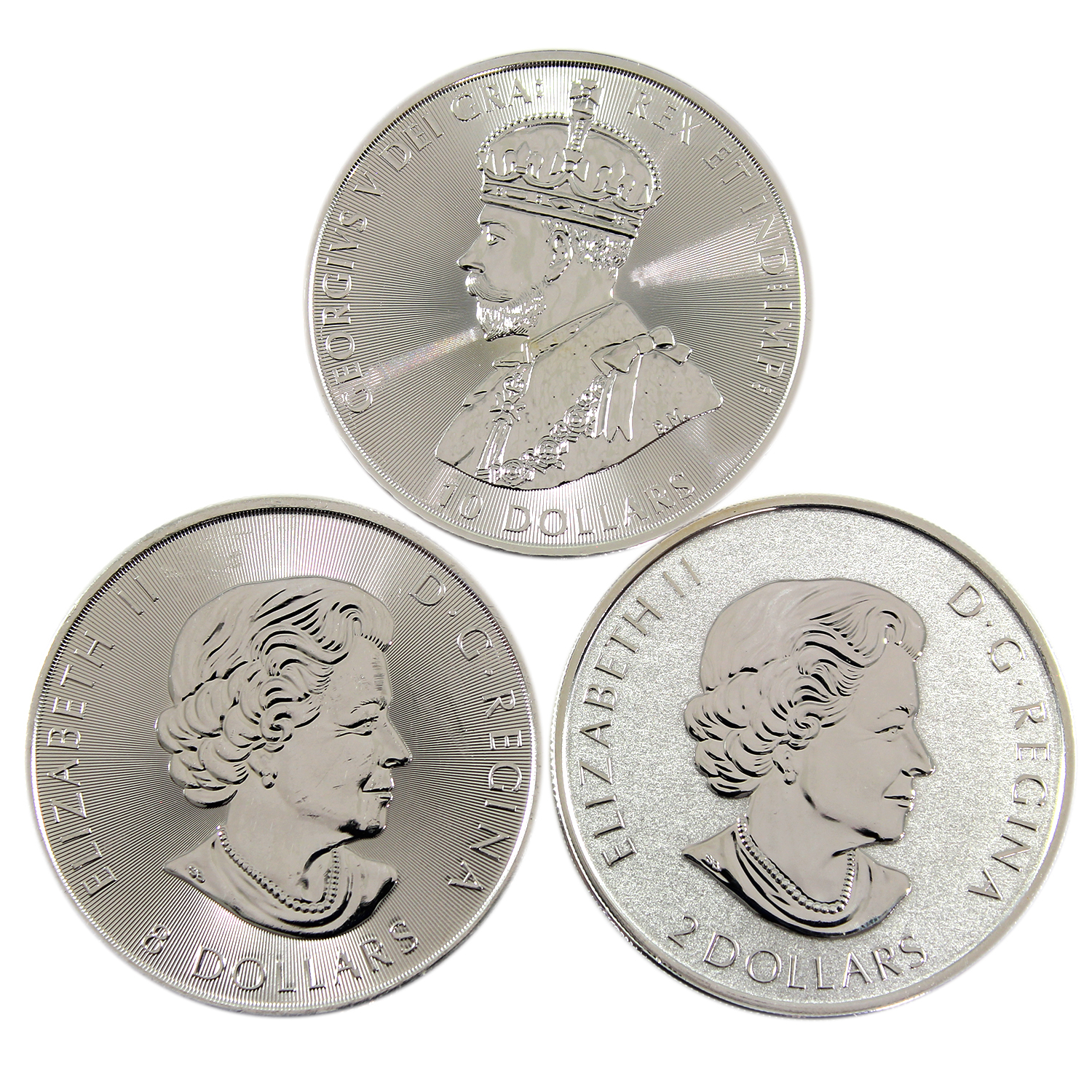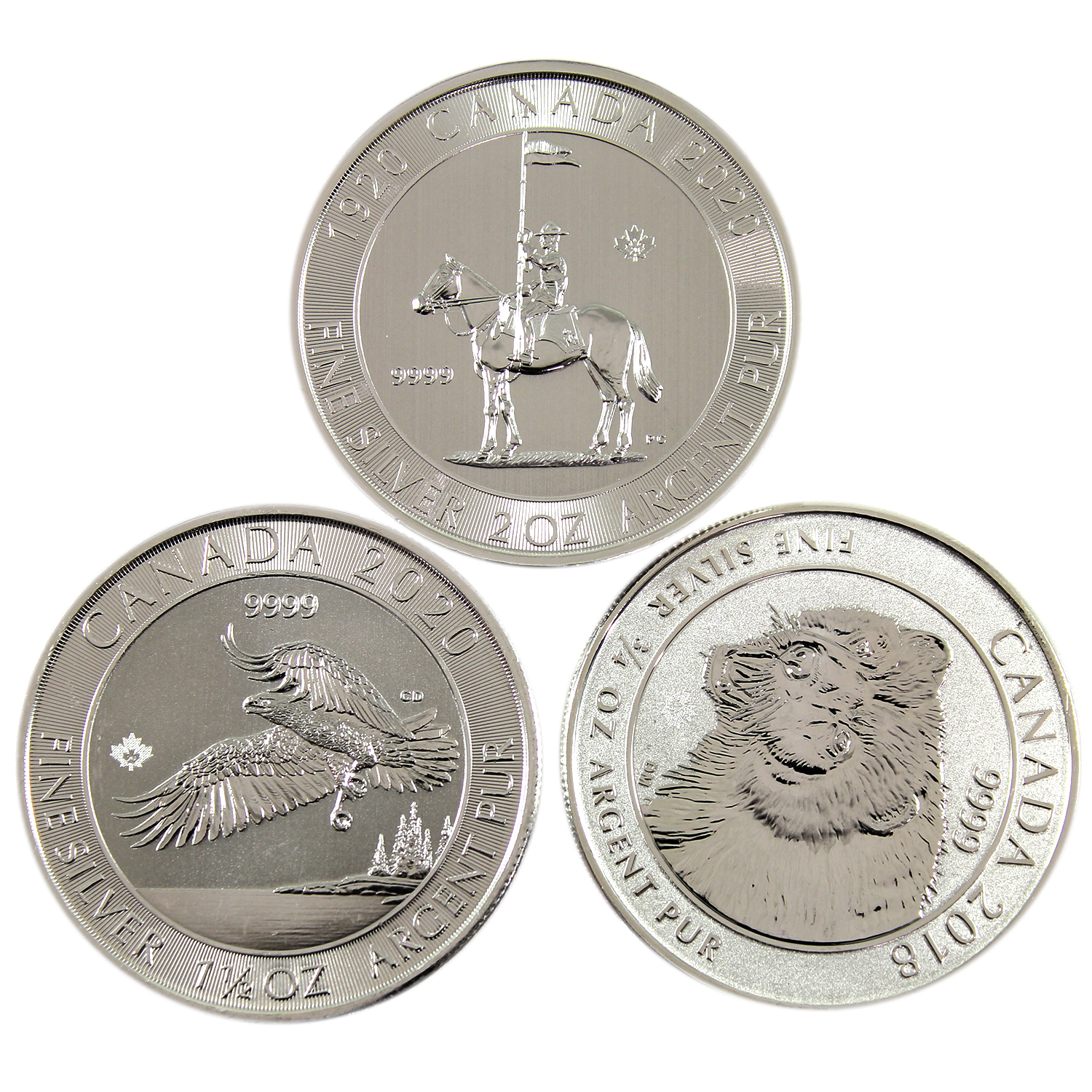 INCLUDES: 3/4oz 2018 $2 Wolverine, 1.5oz 2020 $8 Eagle, & 2oz 2020 $10 Royal Canadian Mounted Police. 3pcs. (Tax Exempt)