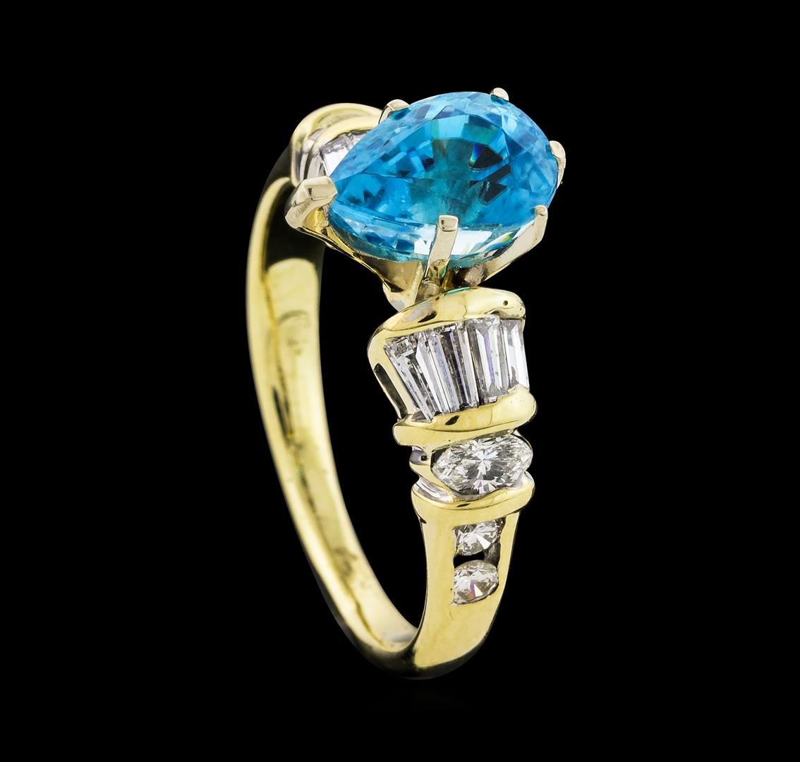 One Blue Zircon and Diamond Ring featuring: 14KT Yellow Gold with a total weight of 4.27 grams, Blue Zircon with a total weight of 3.26ct, and side diamonds with a total weight of 0.50ctw.