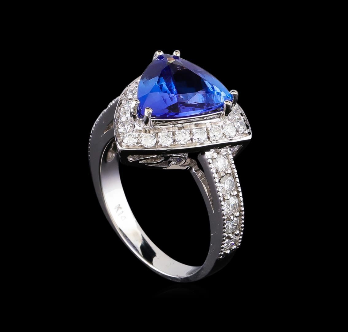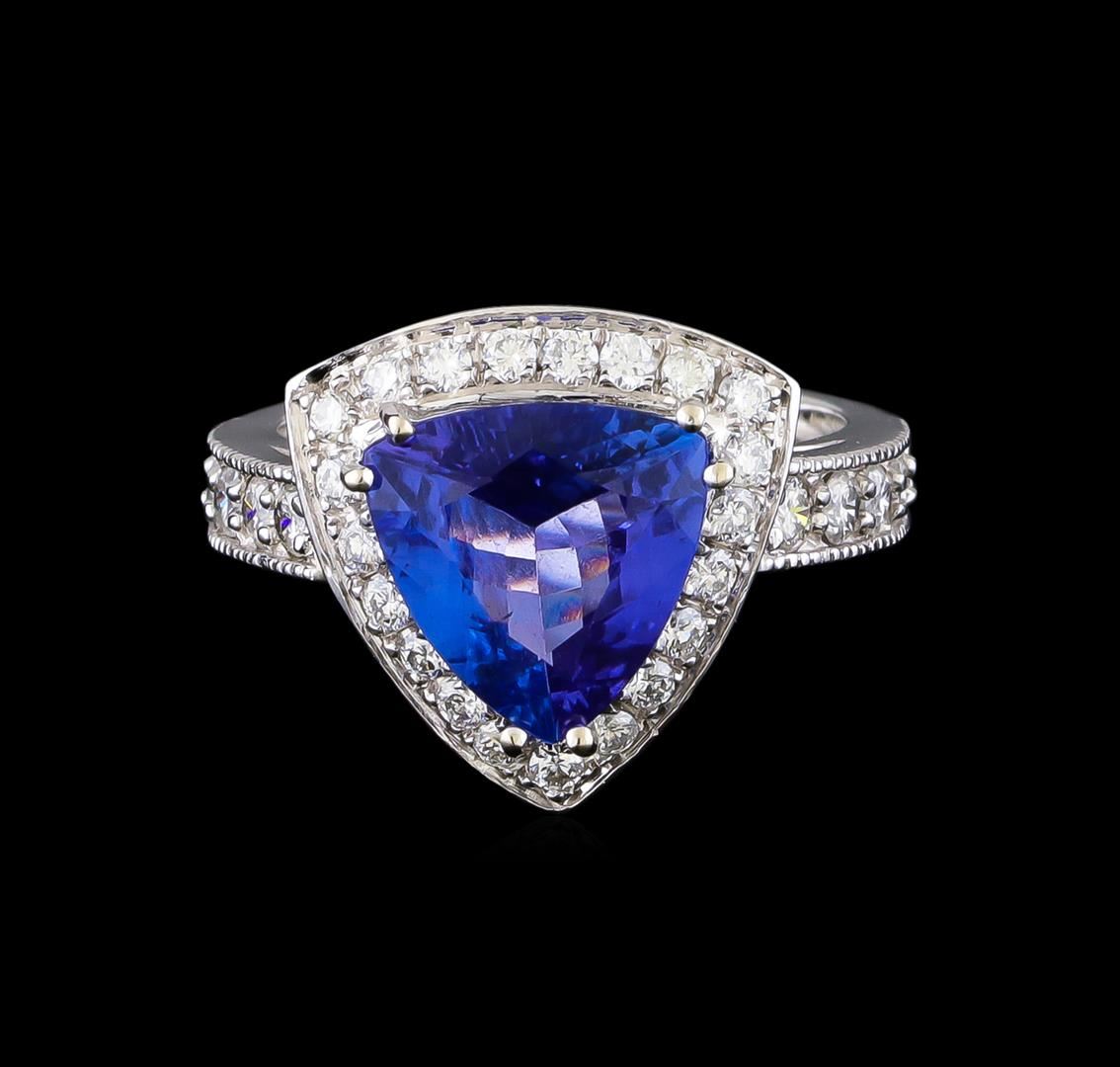 One electronically tested 14KT white gold lady's cast fashion ring with a cathedral halo with a bright polish finish. The featured lady's ring has a shank measuring 2.80 millimeters in width. Identified with markings of "K14". Condition is new, good workmanship. Containing: One prong set triangle modified brilliant cut natural tanzanite, measuring 10.64 x 10.40 x 4.83mm, (depth est.) approximate weight of 3.26ct., clarity is eye clean, medium, moderately strong, bluish violet color, (GIA bV 5/4), cut is very good. Transmitting light with no distortion, transparent. Colored gemstones are presumed to have been subjected to commonly used enhancement processes. Graded in the setting. Ten prong set round brilliant cut diamonds, measuring 2.30 - 2.25 x 1.41mm (depth est.) approximate total weight of 10 Stones = 0.45ct. Graded in the setting. Clarity: SI-1 to SI-2. Color: G - Good Twenty-One prong set round brilliant cut diamonds, measuring 1.80 - 1.70 x 1.05mm (depth est.) approximate total weight of 21 Stones = 0.40ct. Graded in the setting. Clarity: VS-2 to SI-1. Color: G - Good. Total Weight of Colored Stones 3.26ct. Total Weight of Diamonds 0.85ct. Total Weight of Ring 6.70gm GAS Appraised at $7,255.00.