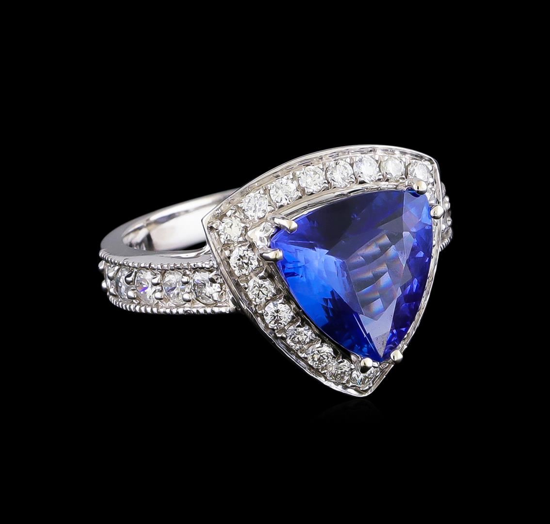 One electronically tested 14KT white gold lady's cast fashion ring with a cathedral halo with a bright polish finish. The featured lady's ring has a shank measuring 2.80 millimeters in width. Identified with markings of "K14". Condition is new, good workmanship. Containing: One prong set triangle modified brilliant cut natural tanzanite, measuring 10.64 x 10.40 x 4.83mm, (depth est.) approximate weight of 3.26ct., clarity is eye clean, medium, moderately strong, bluish violet color, (GIA bV 5/4), cut is very good. Transmitting light with no distortion, transparent. Colored gemstones are presumed to have been subjected to commonly used enhancement processes. Graded in the setting. Ten prong set round brilliant cut diamonds, measuring 2.30 - 2.25 x 1.41mm (depth est.) approximate total weight of 10 Stones = 0.45ct. Graded in the setting. Clarity: SI-1 to SI-2. Color: G - Good Twenty-One prong set round brilliant cut diamonds, measuring 1.80 - 1.70 x 1.05mm (depth est.) approximate total weight of 21 Stones = 0.40ct. Graded in the setting. Clarity: VS-2 to SI-1. Color: G - Good. Total Weight of Colored Stones 3.26ct. Total Weight of Diamonds 0.85ct. Total Weight of Ring 6.70gm GAS Appraised at $7,255.00.