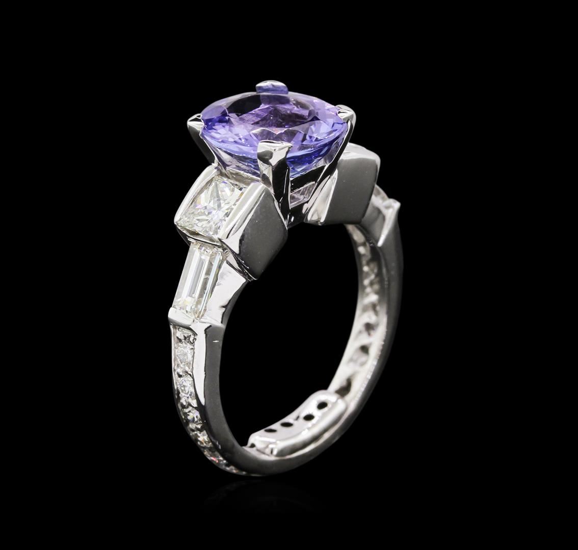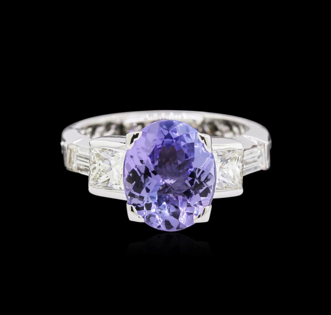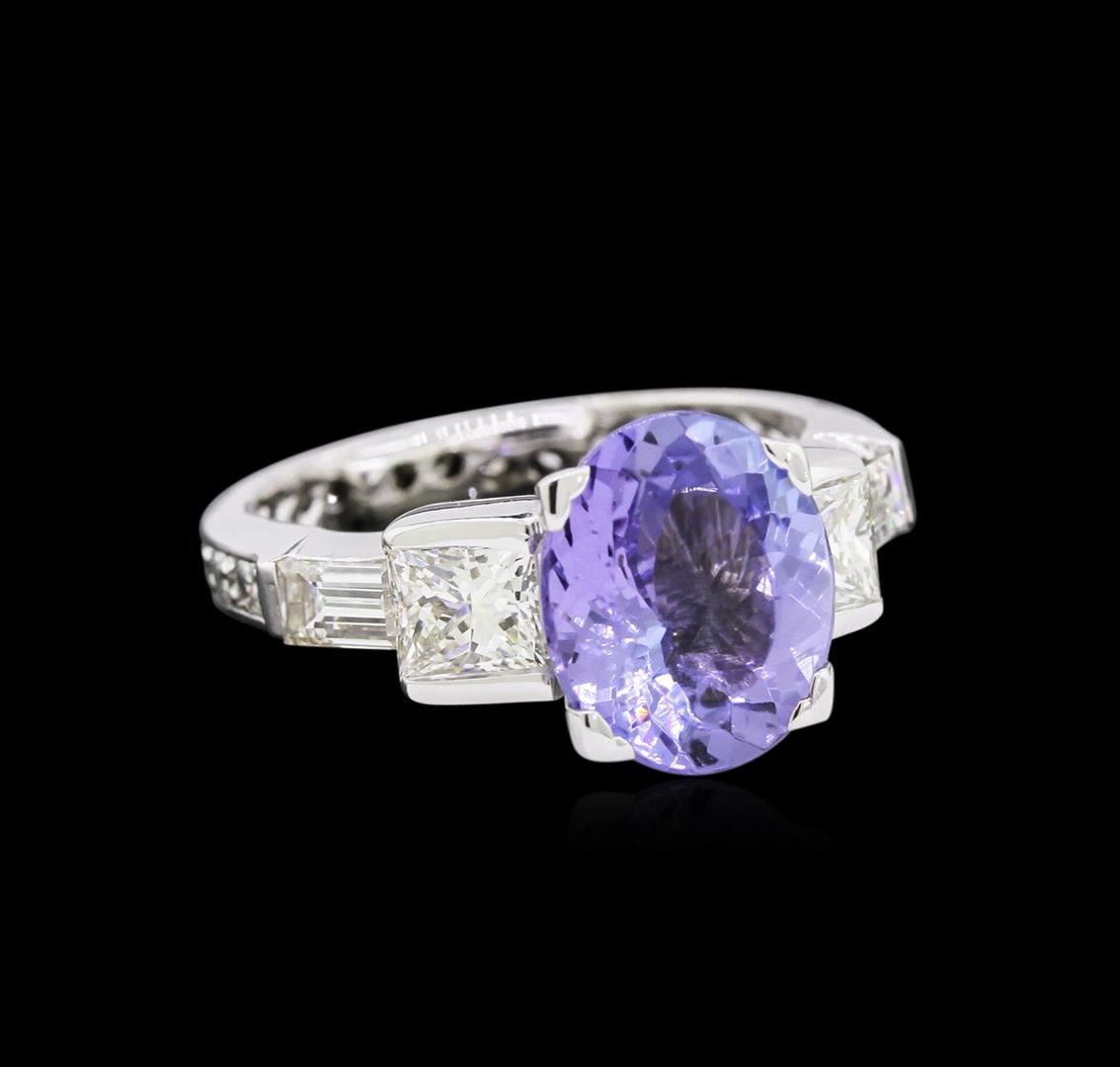 One electronically tested platinum lady's combination cast & assembled fashion ring with a bright polish finish. The featured lady's ring has a diamond eternity shank measuring 3.10 millimeters wide. Condition is used, good workmanship. Containing: One prong set oval modified brilliant cut natural tanzanite, measuring 10.98 x 9.02 x 4.65mm, approximate weight of 3.26ct., clarity is eye clean, type I, medium light, very slightly grayish, bluish violet color, (GIA bV 4/3), cut is good. Transmitting light with no distortion, transparent. Colored gemstones are presumed to have been subjected to commonly used enhancement processes. Graded in the setting. Two channel set princess cut diamonds, measuring 4.40 x 4.35 x 3.26mm (depth est.) approximate total weight of 2 Stones = 1.04ct. Graded in the setting. Clarity: VS-1 to VS-2. Color: Very Good Two channel set baguette cut diamonds, measuring 5.00 x 2.60 x 2.21mm (depth est.) approximate total weight of 2 Stones = 0.50ct. Graded in the setting. Clarity: VS-1 to VS-2. Color: F - Very Good Nineteen prong set round brilliant cut diamonds, measuring 2.00 - 1.90 x 1.17mm (depth est.) approximate total weight of 19 Stones = 0.51ct. Graded in the setting. Clarity: VS-2 to SI-1. Color: G - I. Cut Good. Total Weight of Colored Stones 3.26ct. Total Weight of Diamonds 2.05ct. Total Weight of Ring 9.40gm. GAS Appraised at $14,960.00.