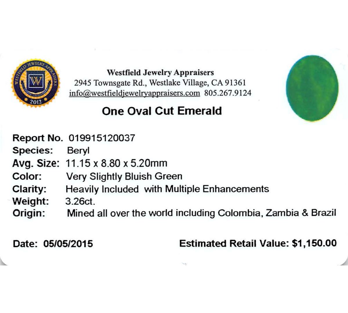 One oval mixed cut natural emerald, measuring 11.15 x 8.80 x 5.20mm, exact weight 3.26ct., clarity is heavily included, type III, dark, very slightly grayish, very slightly bluish green color, (GIA vslbG 7/3), cut is good. Indications of multiple laboratory enhancements, including high temperature heat treatment. Westfield Appraised at $1,150.00.