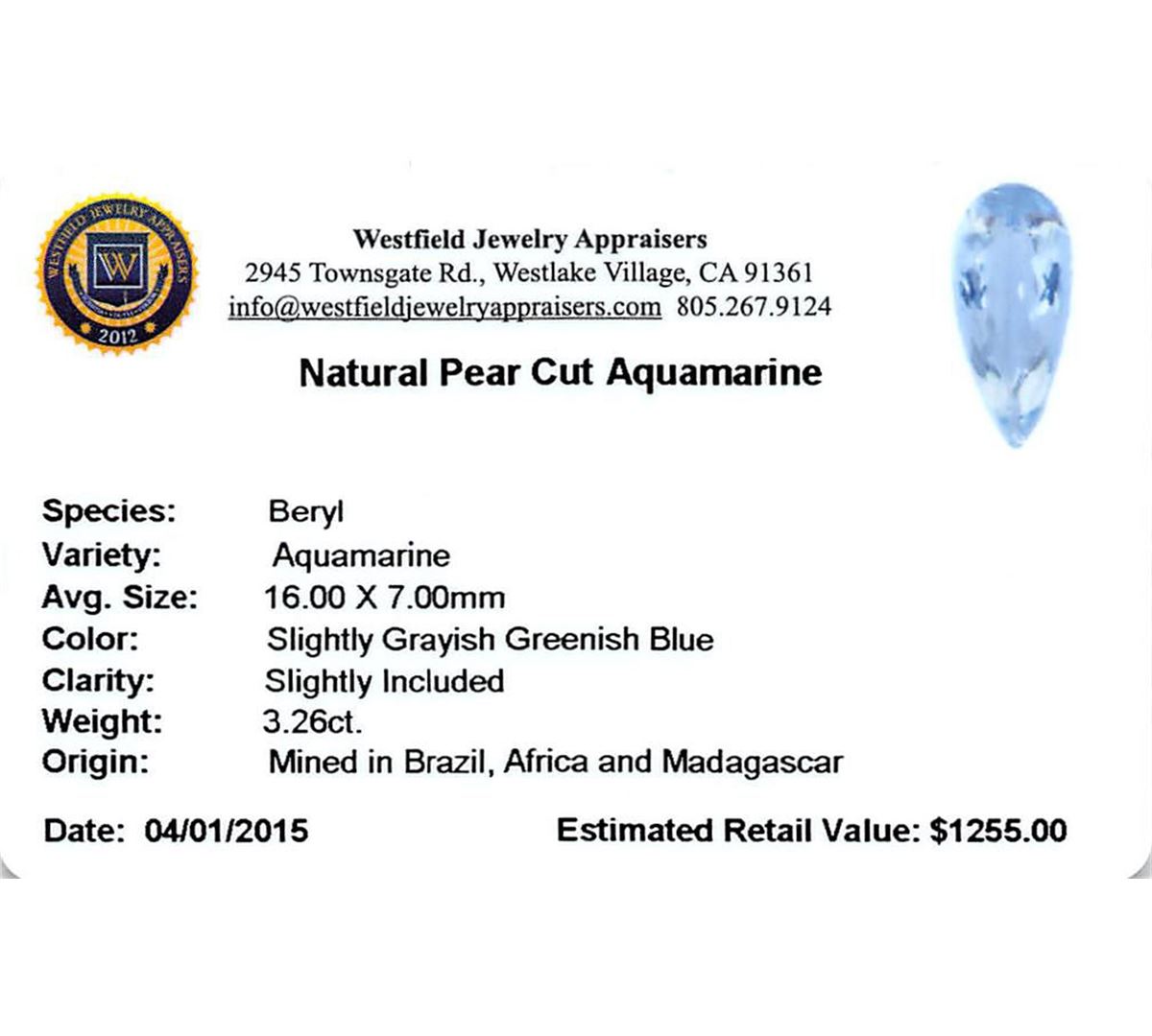 One pear cut natural aquamarine exact weight 3.26ct., clarity is slightly included, type I, medium, very slightly grayish, very slightly greenish blue color, (GIA vslgB 5/3), cut is good. Westfield Appraised at $1,255.00.