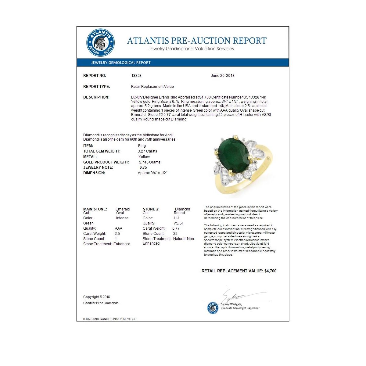 REF-71X5T -13328 ---- 3.27 CTW Emerald & Diamond Ring 14K Yellow Gold ---- Luxury Designer Brand Ring Appraised at $4,700 Certificate Number US13328 14k Yellow gold, Ring Size is 6.75, Ring measuring approx. 3/4" x 1/2" , weighing in total approx. 5.2 grams. Made in the USA and is stamped 14k, Main stone 2.5 carat total weight containing 1 pieces of Intense Green color with AAA quality Oval shape cut Emerald , Stone #2 0.77 carat total weight containing 22 pieces of H-I color with VS/SI quality Round shape cut Diamond