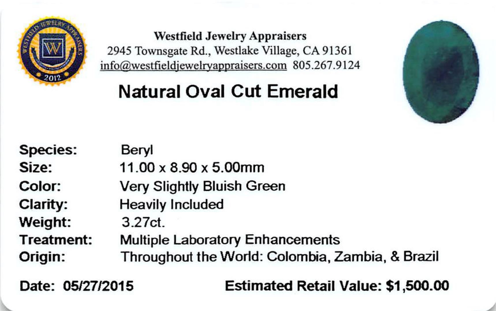 One oval mixed cut natural emerald, measuring 11.00 x 8.90 x 5.00mm, exact weight 3.27ct., clarity is heavily included, medium dark, very slightly grayish, very slightly bluish green color, (GIA vslbG 6/3), cut is good. Transmitting light somewhat diffusely, translucent, Naturally occurring internal & external characteristics are present, Indications of multiple laboratory enhancements, including high temperature heat treatment. Westfield Appraised at $1,500.00.