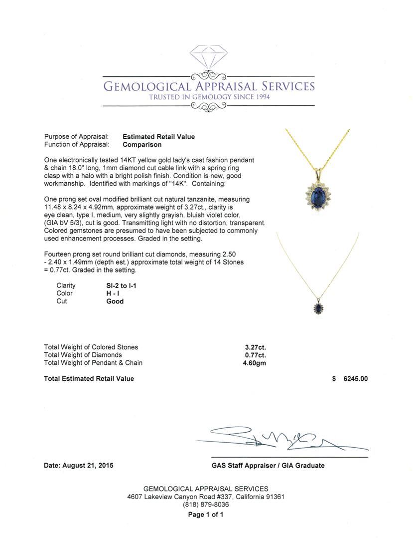 One electronically tested 14KT yellow gold lady's cast fashion pendant & chain 18.0" long, 1mm diamond cut cable link with a spring ring clasp with a halo with a bright polish finish. Identified with markings of "14K". Condition is new, good workmanship. Containing: One prong set oval modified brilliant cut natural tanzanite, measuring 11.48 x 8.24 x 4.92mm, approximate weight of 3.27ct., clarity is eye clean, type I, medium, very slightly grayish, bluish violet color, (GIA bV 5/3), cut is good. Transmitting light with no distortion, transparent. Colored gemstones are presumed to have been subjected to commonly used enhancement processes. Graded in the setting. Fourteen prong set round brilliant cut diamonds, measuring 2.50 - 2.40 x 1.49mm (depth est.) approximate total weight of 14 Stones = 0.77ct. Graded in the setting. Clarity: SI-2 to I-1. Color: H - I. Cut Good. Total Weight of Colored Stones 3.27ct. Total Weight of Diamonds 0.77ct. Total Weight of Pendant & Chain 4.60gm. GAS Appraised at $6,245.00.
