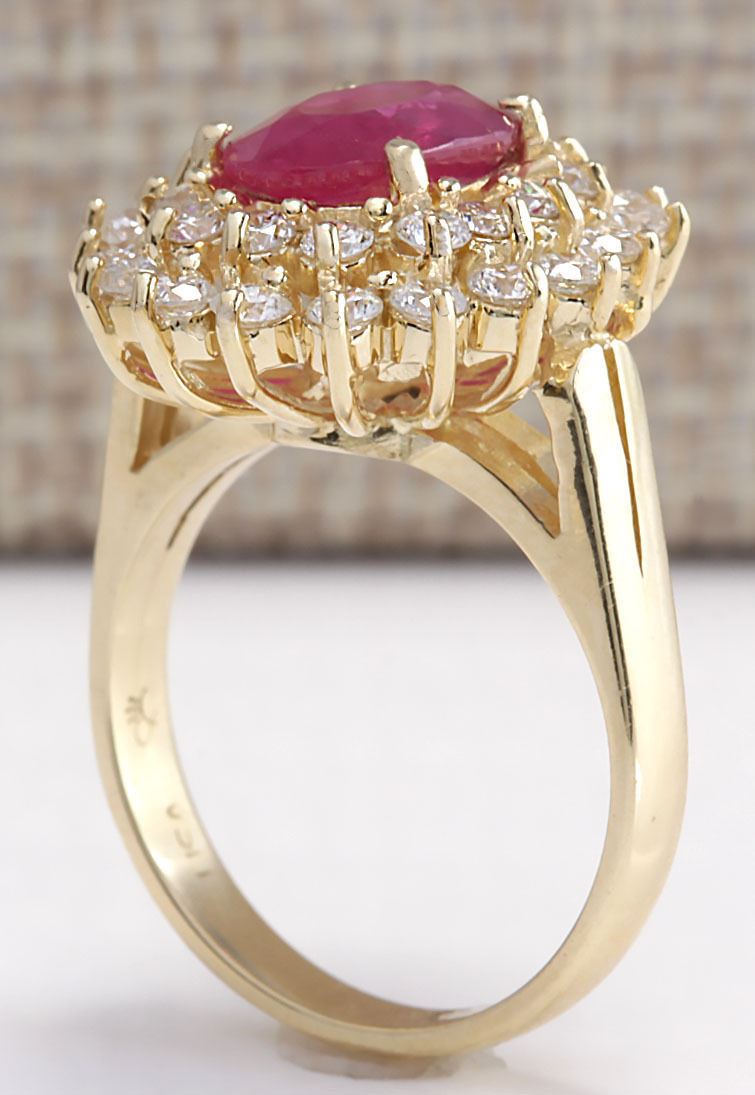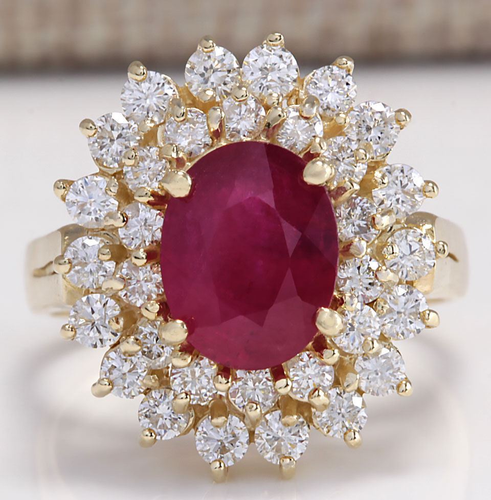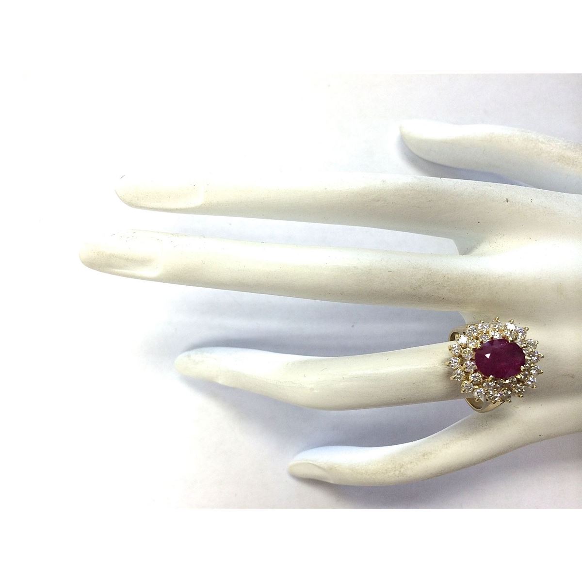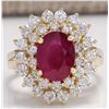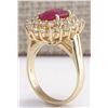 Stamped: 14K Ring Size: 5.75 Total Ring Weight: 6 Grams Diamond Weight: Total natural diamond weight is 1.10carat. SI1-SI2 clarity / G-H color Gemstone Weight: Total Natural Mozambique Ruby Weight is 2.17ctw (Measures: 9.04x7.04mm) Heated only , no glass or led filling Face Measures: 18.10x15.76mm Main stone color: Red [SKU:702866]