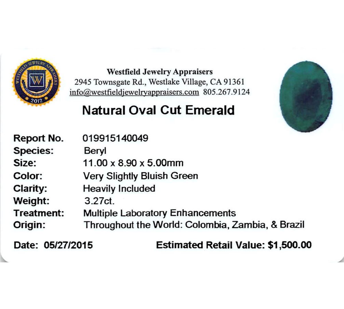 One oval mixed cut natural emerald, measuring 11.00 x 8.90 x 5.00mm, exact weight 3.27ct., clarity is heavily included, medium dark, very slightly grayish, very slightly bluish green color, (GIA vslbG 6/3), cut is good. Transmitting light somewhat diffusely, translucent, Naturally occurring internal & external characteristics are present, Indications of multiple laboratory enhancements, including high temperature heat treatment. Westfield Appraised at $1,500.00.