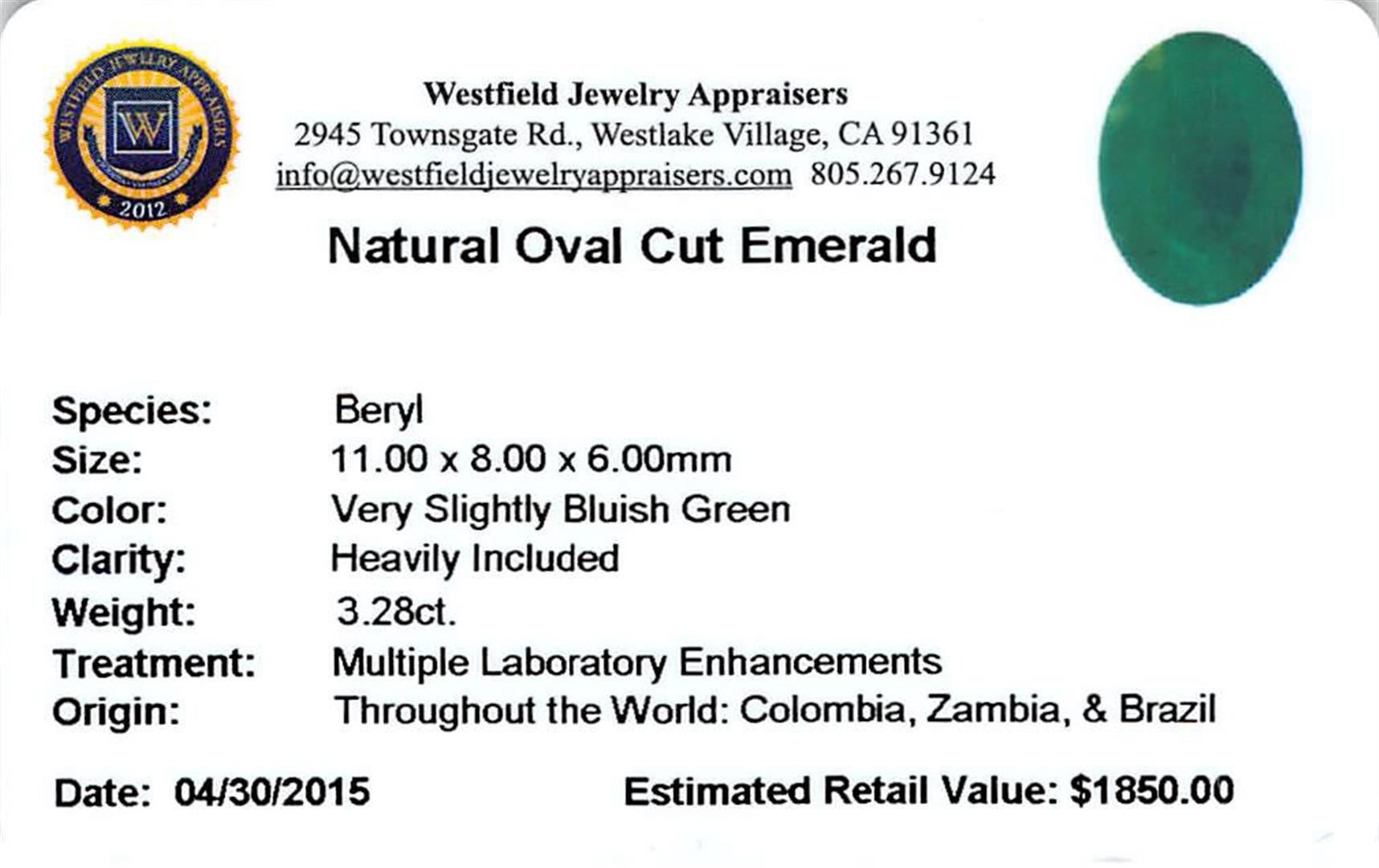 One oval cut natural emerald, measuring 11.00 x 8.00 x 6.00mm, exact weight 3.28ct., clarity is heavily included, type III, medium dark, very slightly grayish, very slightly bluish green color, (GIA vslbG 6/3), cut is good. Westfield Appraised at $1,850.00.