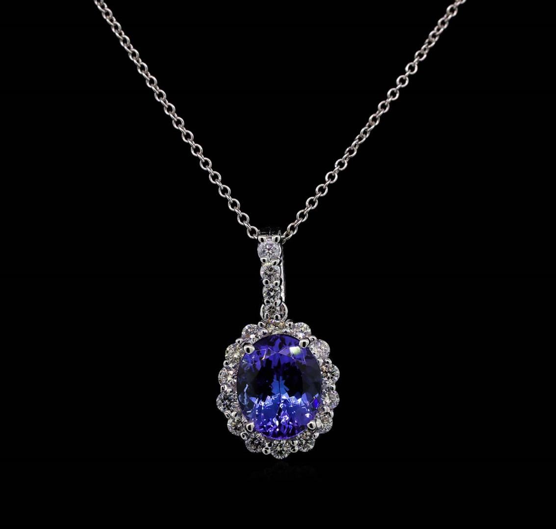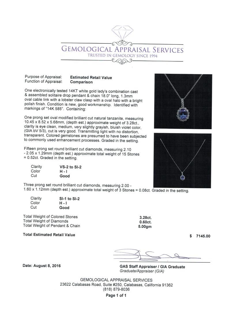 One electronically tested 14KT white gold lady's combination cast & assembled solitaire drop pendant & chain 18.0' long, 1.3mm oval cable link with a lobster claw clasp with a oval halo with a bright polish finish. Identified with markings of '14K 585'. Condition is new, good workmanship. Containing: One prong set oval modified brilliant cut natural tanzanite, measuring 10.45 x 8.52 x 5.68mm, (depth est.) approximate weight of 3.28ct., clarity is eye clean, medium, very slightly grayish, bluish violet color, (GIA bV 5/3), cut is very good. Transmitting light with no distortion, transparent. Colored gemstones are presumed to have been subjected to commonly used enhancement processes. Graded in the setting. Fifteen prong set round brilliant cut diamonds, measuring 2.10 - 2.05 x 1.29mm (depth est.) approximate total weight of 15 Stones = 0.52ct. Graded in the setting. Clarity VS-2 to SI-2. Color: H - I Cut Good Three prong set round brilliant cut diamonds, measuring 2.00 - 1.60 x 1.12mm (depth est.) approximate total weight of 3 Stones = 0.08ct. Graded in the setting. Clarity SI-1 to SI-2. Color: H - I Cut Good. Total Weight of Colored Stones 3.28ct.. Total Weight of Diamonds 0.60ct.. Total Weight of Pendant & Chain 5.00gm. GAS Appraised at $7,145.00.