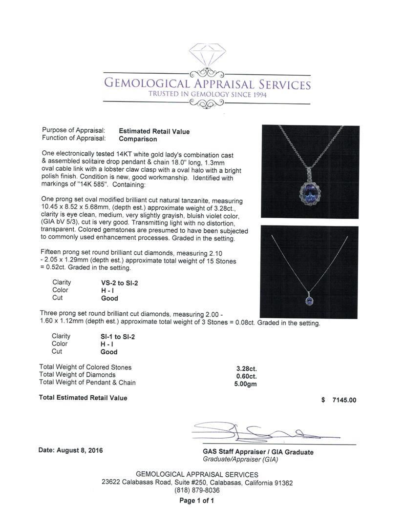 One electronically tested 14KT white gold lady's combination cast & assembled solitaire drop pendant & chain 18.0' long, 1.3mm oval cable link with a lobster claw clasp with a oval halo with a bright polish finish. Identified with markings of '14K 585'. Condition is new, good workmanship. Containing: One prong set oval modified brilliant cut natural tanzanite, measuring 10.45 x 8.52 x 5.68mm, (depth est.) approximate weight of 3.28ct., clarity is eye clean, medium, very slightly grayish, bluish violet color, (GIA bV 5/3), cut is very good. Transmitting light with no distortion, transparent. Colored gemstones are presumed to have been subjected to commonly used enhancement processes. Graded in the setting. Fifteen prong set round brilliant cut diamonds, measuring 2.10 - 2.05 x 1.29mm (depth est.) approximate total weight of 15 Stones = 0.52ct. Graded in the setting. Clarity VS-2 to SI-2. Color: H - I Cut Good Three prong set round brilliant cut diamonds, measuring 2.00 - 1.60 x 1.12mm (depth est.) approximate total weight of 3 Stones = 0.08ct. Graded in the setting. Clarity SI-1 to SI-2. Color: H - I Cut Good. Total Weight of Colored Stones 3.28ct.. Total Weight of Diamonds 0.60ct.. Total Weight of Pendant & Chain 5.00gm. GAS Appraised.