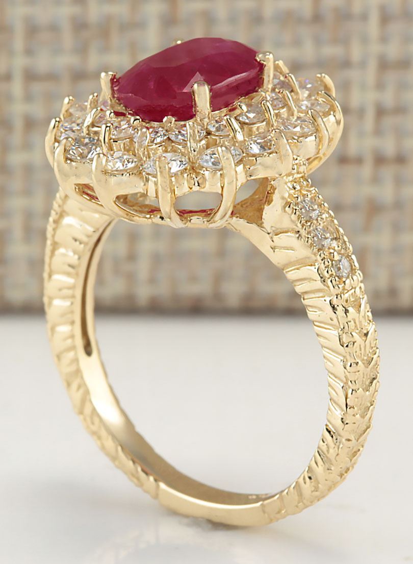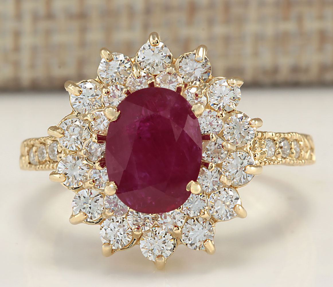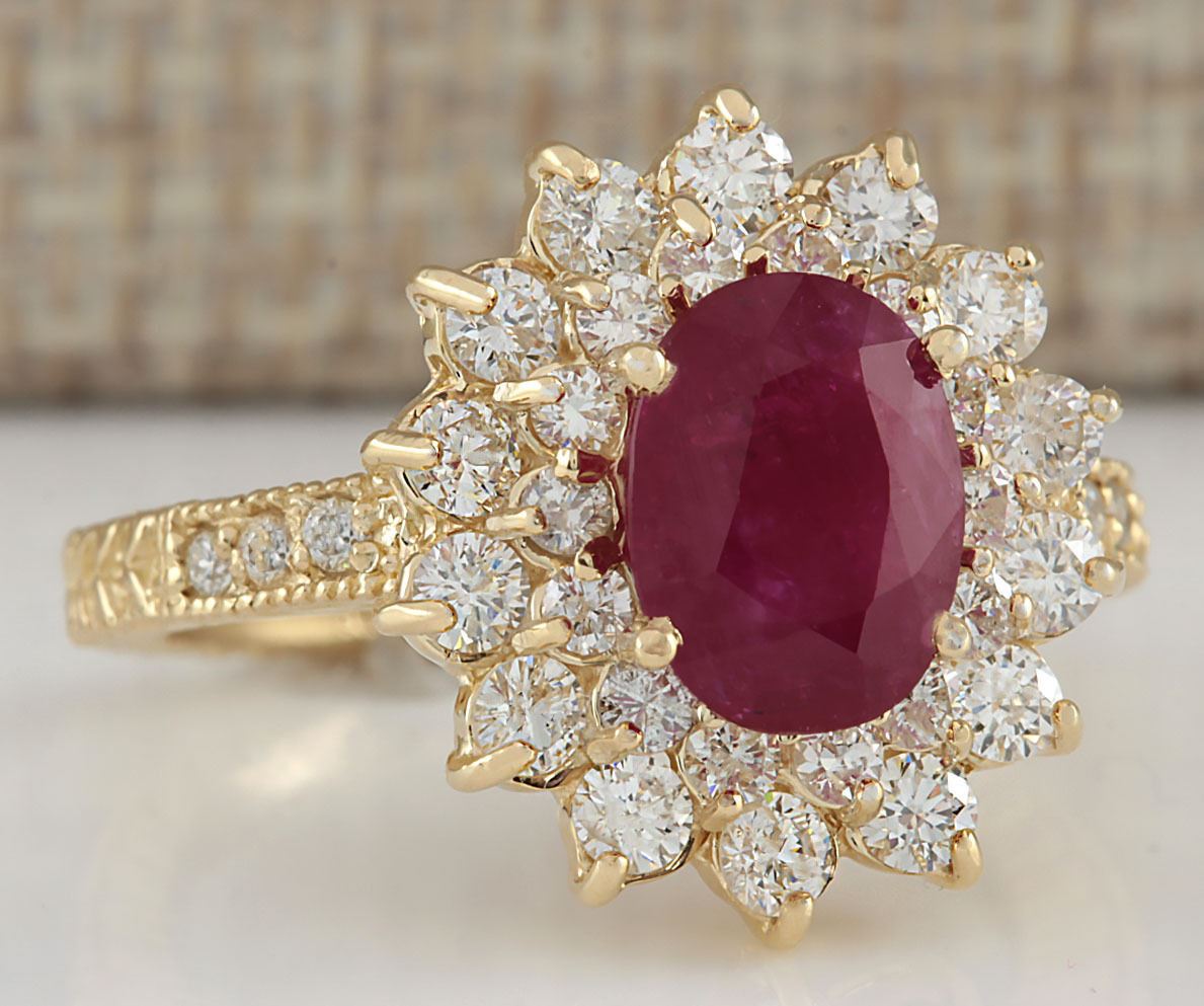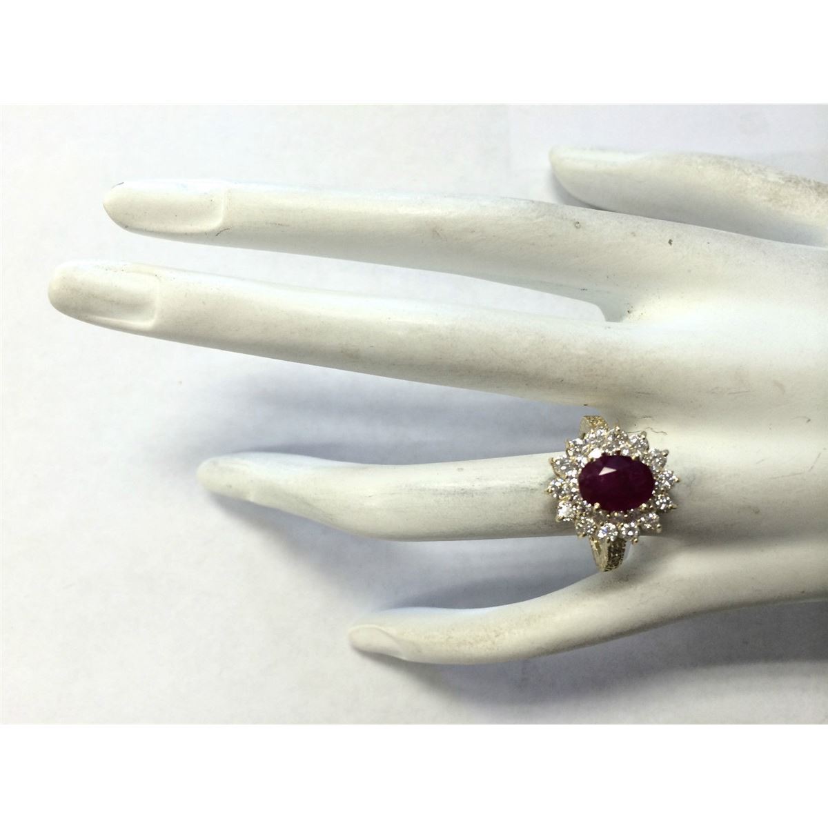 Stamped: 14K Ring Size: 6.75 Total Ring Weight: 5.2 Grams Diamond Weight: Total natural diamond weight is 1.20carat. SI1-SI2 clarity / G-H color Gemstone Weight: Total Natural Ruby Weight is 2.08ctw (Measures: 9.03x7.10mm) Heated ruby only , no glass or led filling ! Face Measures: 16.90x15.28mm Main stone color: Red [SKU:702167]