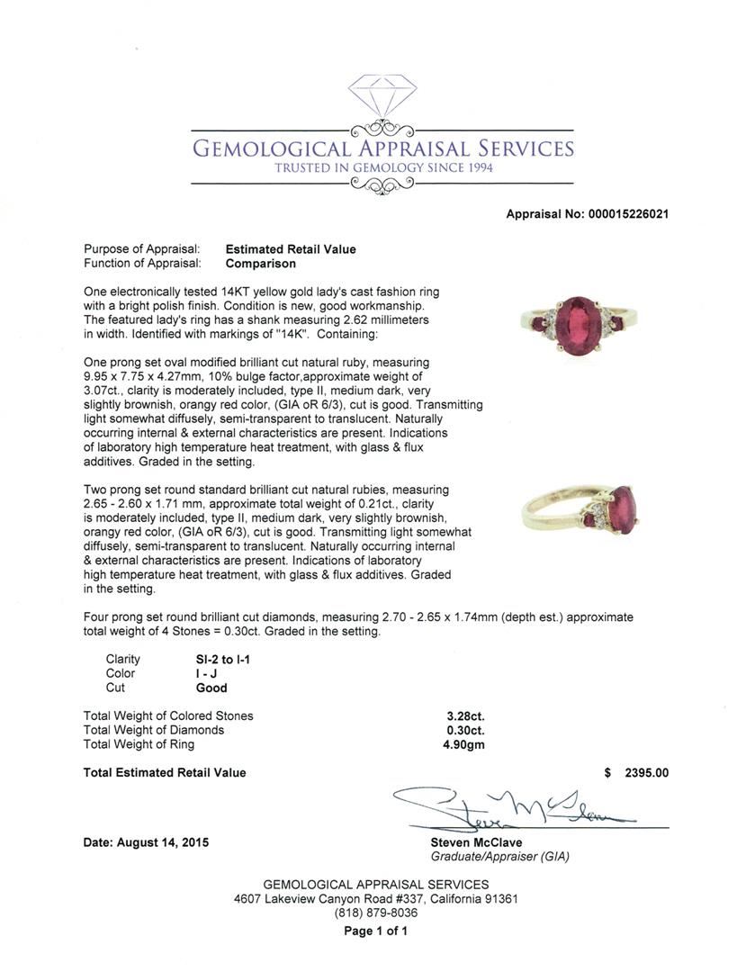 One electronically tested 14KT yellow gold lady's cast fashion ring with a bright polish finish. The featured lady's ring has a shank measuring 2.62 millimeters in width. Identified with markings of "14K". Condition is new, good workmanship. Containing: One prong set oval modified brilliant cut natural ruby, measuring 9.95 x 7.75 x 4.27mm, 10% bulge factor, approximate weight of 3.07ct., clarity is moderately included, type II, medium dark, very slightly brownish, orangy red color, (GIA oR 6/3), cut is good. Transmitting light somewhat diffusely, semi-transparent to translucent. Naturally occurring internal & external characteristics are present. Indications of laboratory high temperature heat treatment, with glass & flux additives. Graded in the setting. Two prong set round standard brilliant cut natural rubies, measuring 2.65 - 2.60 x 1.71 mm, approximate total weight of 0.21ct., clarity is moderately included, type II, medium dark, very slightly brownish, orangy red color, (GIA oR 6/3), cut is good. Transmitting light somewhat diffusely, semi-transparent to translucent. Naturally occurring internal & external characteristics are present. Indications of laboratory high temperature heat treatment, with glass & flux additives. Graded in the setting. Four prong set round brilliant cut diamonds, measuring 2.70 - 2.65 x 1.74mm (depth est.) approximate total weight of 4 Stones = 0.30ct. Graded in the setting. Clarity: SI-2 to I-1. Color: I - J. Cut Good. Total Weight of Colored Stones 3.28ct. Total Weight of Diamonds 0.30ct. Total Weight of Ring 4.90gm. GAS Appraised at $2,395.00.