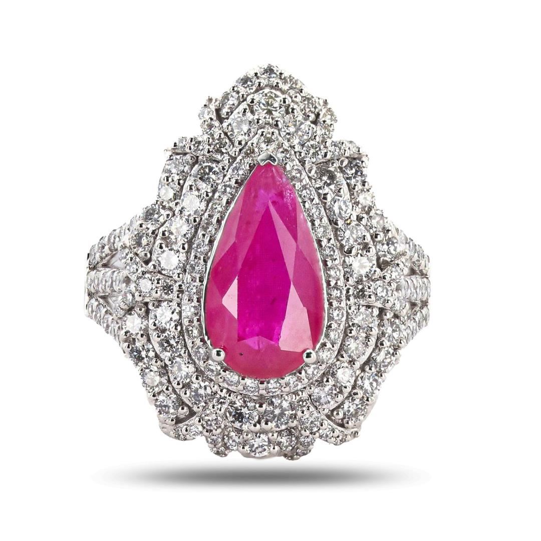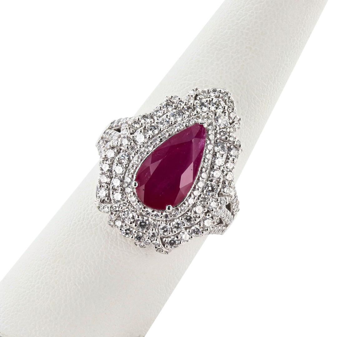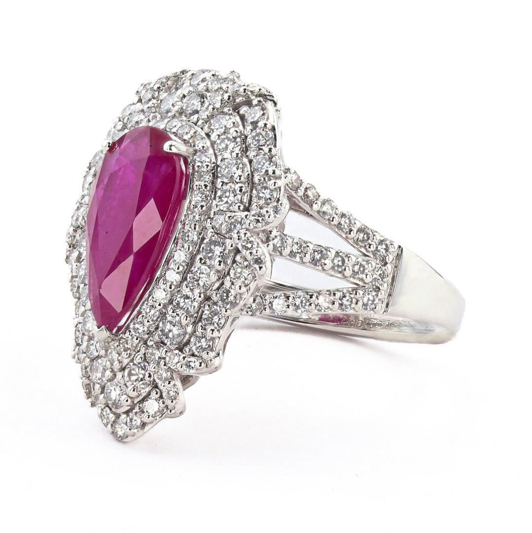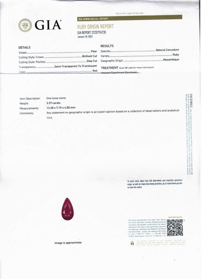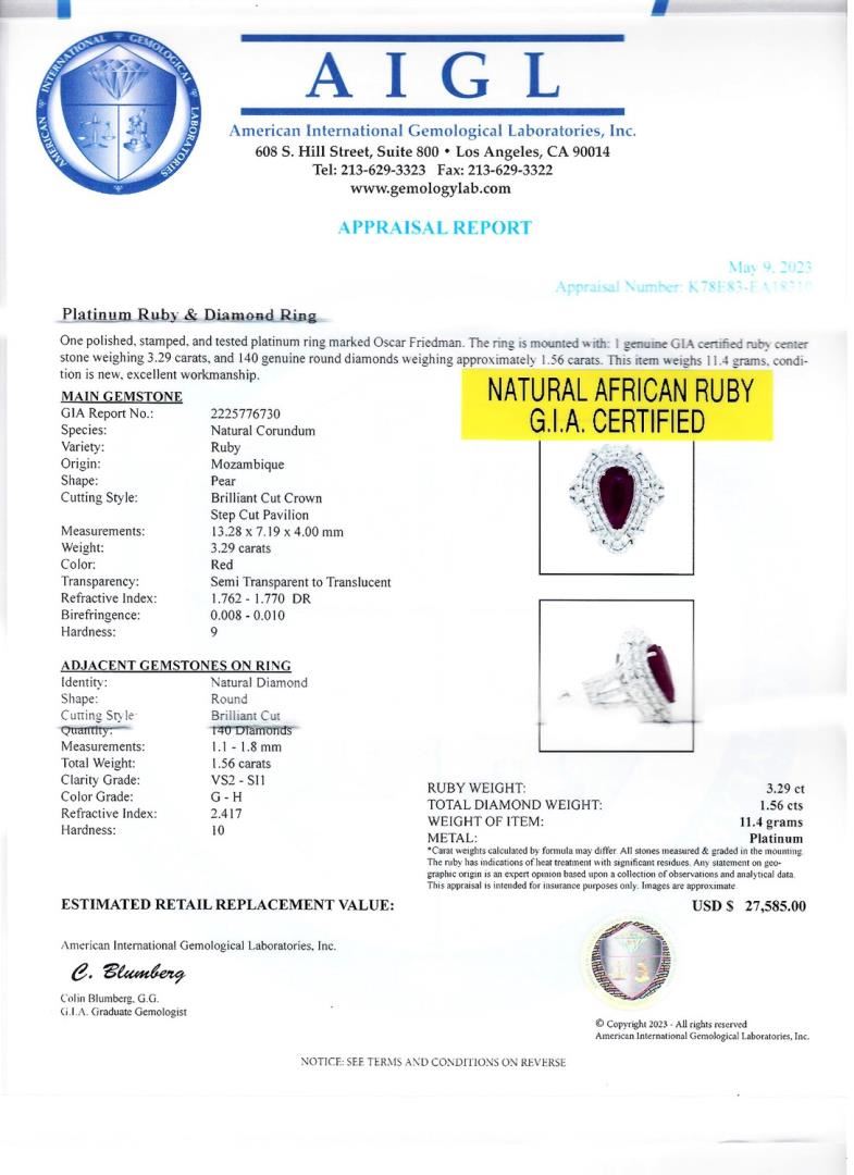 One polished, stamped. and tested platinum ring marked Oscar Friedman. The ring is mounted with: 1 genuine GIA certified ruby center stone weighing 3.29 carats, and 140 genuine round diamonds weighing approximately 1.56 carats. This item weighs 11.4 grams. condition is new, excellent workmanship. #MAIN GEMSTONE# GIA Report No.: 2225776730 Species: Natural Corundum Variety: Ruby Origin: Mozambique Shape: Pear Cutting Style: Brilliant Cut Crown, Step Cut Pavilion Measurements: 13.28 x 7.19 x 4.00mm Weight: 3.29 carats Color: Red Transparency: Semi Transparent to Translucent Refractive Index: 1.762 - 1.770 DR Birefringence: 0.008 - 0.010 Hardness: 9 #ADJACENT GEMSTONES ON RING# Identity: Natural Diamond Shape: Round Cutting Style Brilliant Cut Quantity: 140 Diamonds Measurements: 1.1 - 1.8mm Total Weight: 1.56 carats Clarity Grade: VS2-SI1 Color Grade: G-H Refractive Index: 2.417 Hardness: 10 RUBY WEIGHT: 3.29 ctw TOTAL DIAMOND WEIGHT: 1.56 ctw WEIGHT OF ITEM: 11.4 grams METAL: Platinum