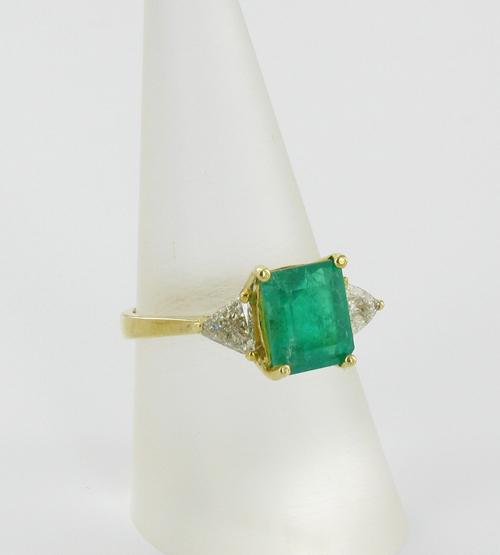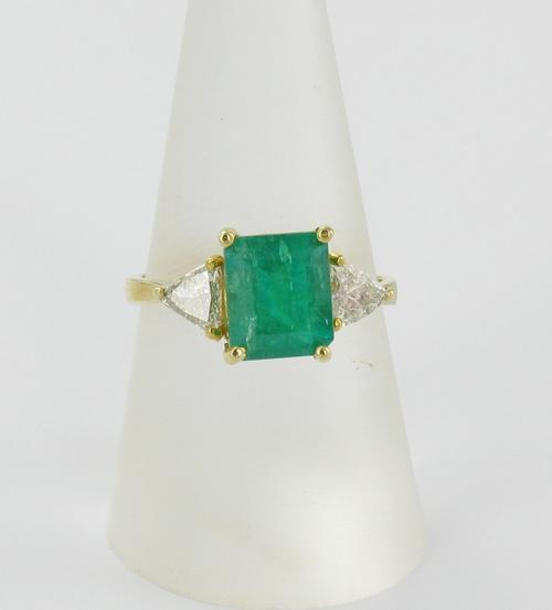 Fabulous new piece with hi grade 2+ ct Green Colombian Emerald & 2 -1/3 ct trilliant cut diamonds; 14k gold 3 gram total weight; $14995 retail