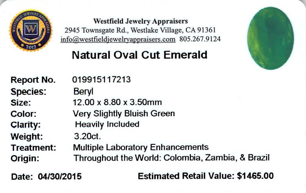 One oval cut natural emerald, measuring 12.00 x 8.80 x 3.50mm, exact weight 3.20ct., clarity is heavily included, type III, medium dark, very slightly grayish, very slightly bluish green color, (GIA vslbG 6/3) Westfield Appraised at $1,465.00.