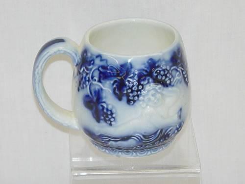 3 3/4" FLOW BLUE SHAVING MUG W/ RAISED DECORATION OF CHERUB W/ GRAPES;