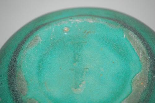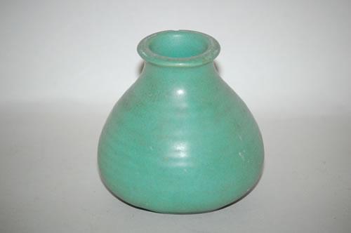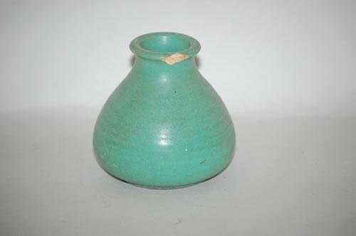 3 3/4" TECO ART POTTERY VASE - TECO MATTE GREEN SQUATTY BULBOUS GOURD SHAPED VASE-DOUBLE MARKED TECO ON BASE - 2 CHIPS ON TOP RIM, WEAR & IMPERFECTIONS