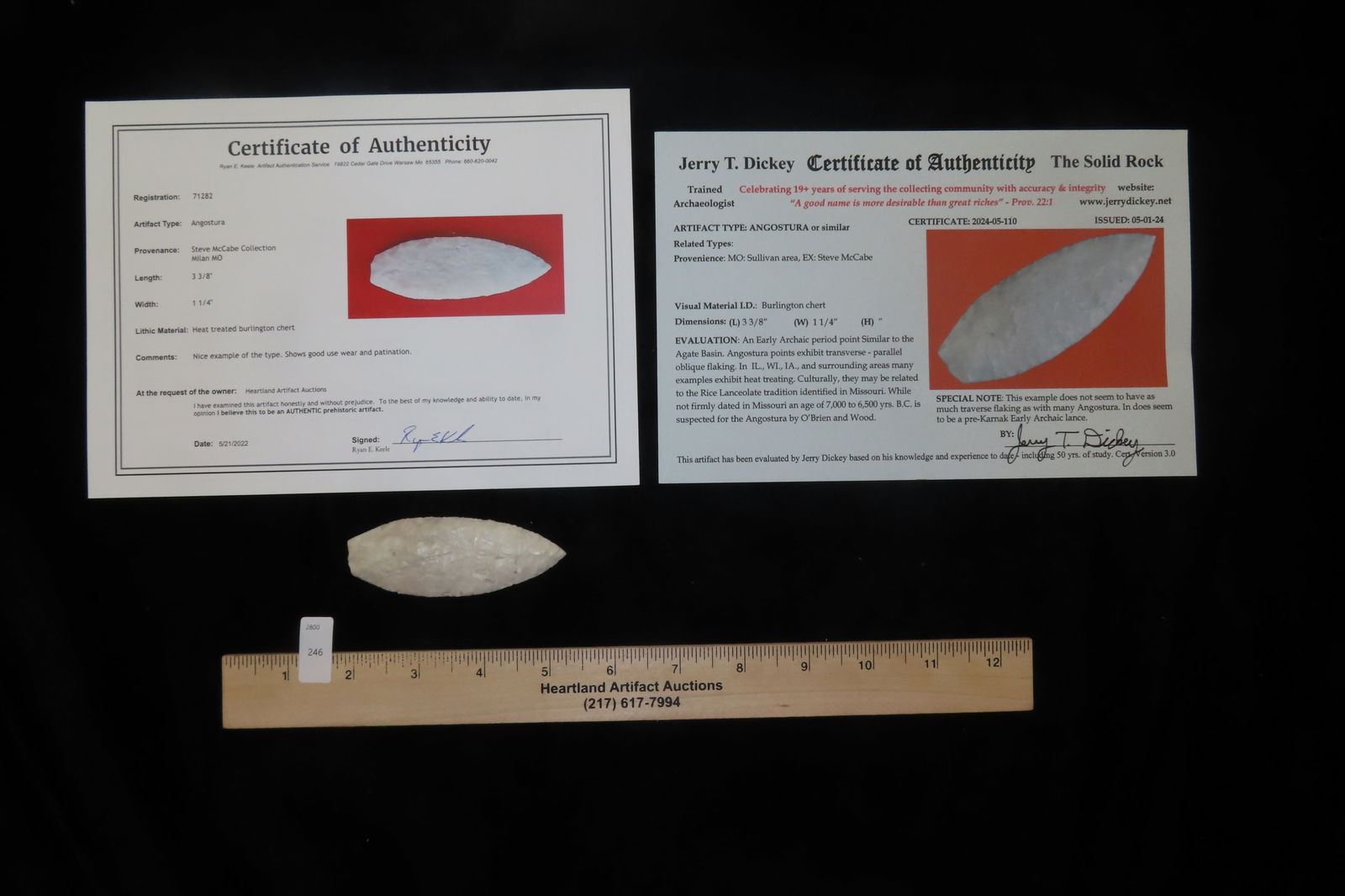 3 3/8& quot; Angostura, Dickey/Keele COA, found in Sullivan Co., Missouri, Ex Steve McCabe Coll.