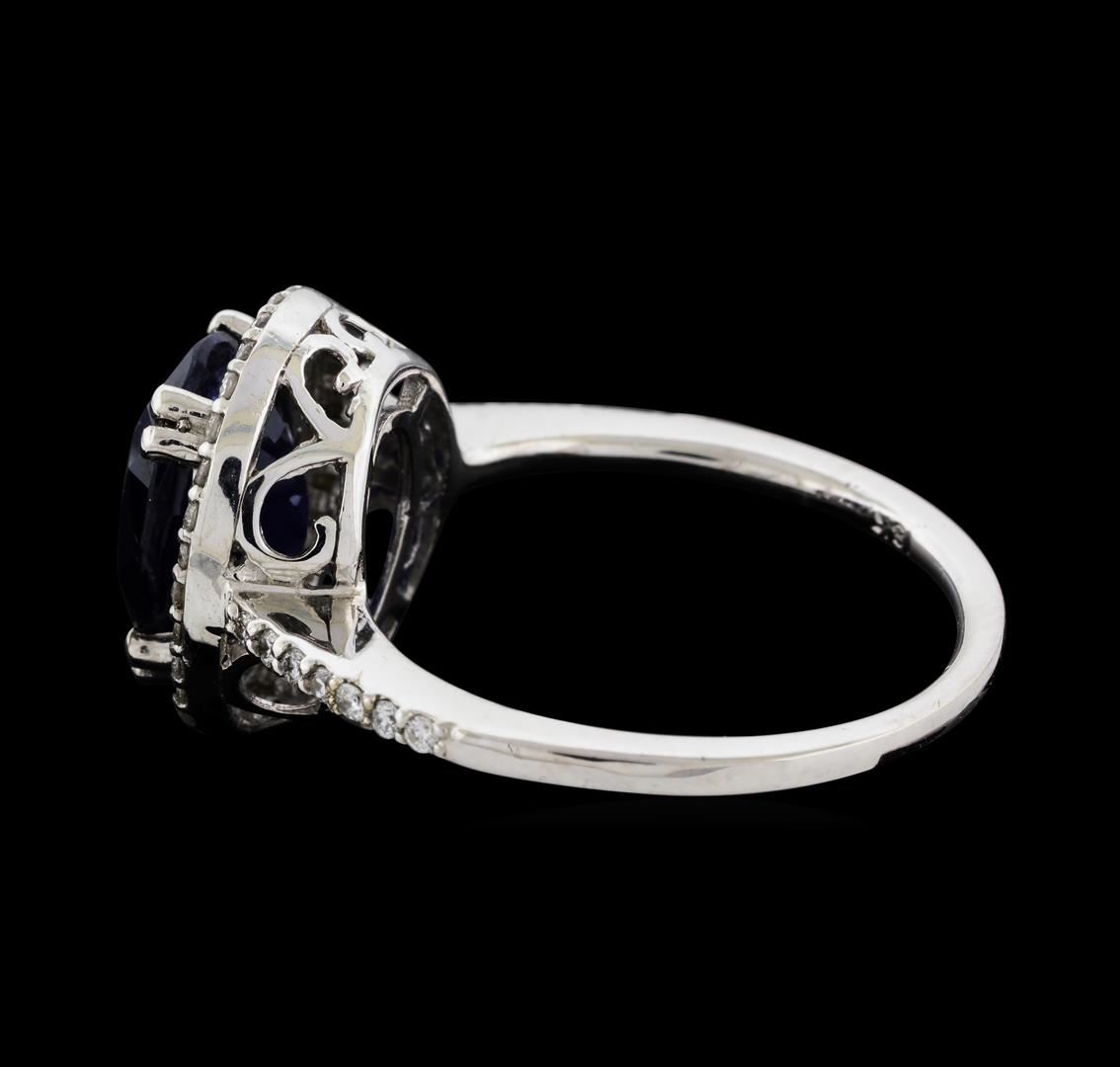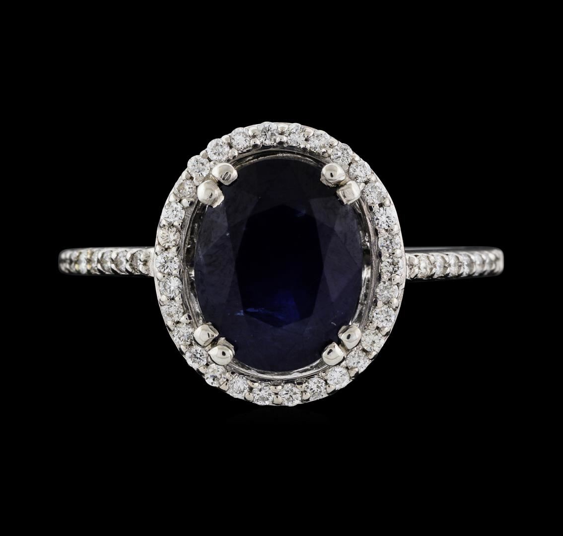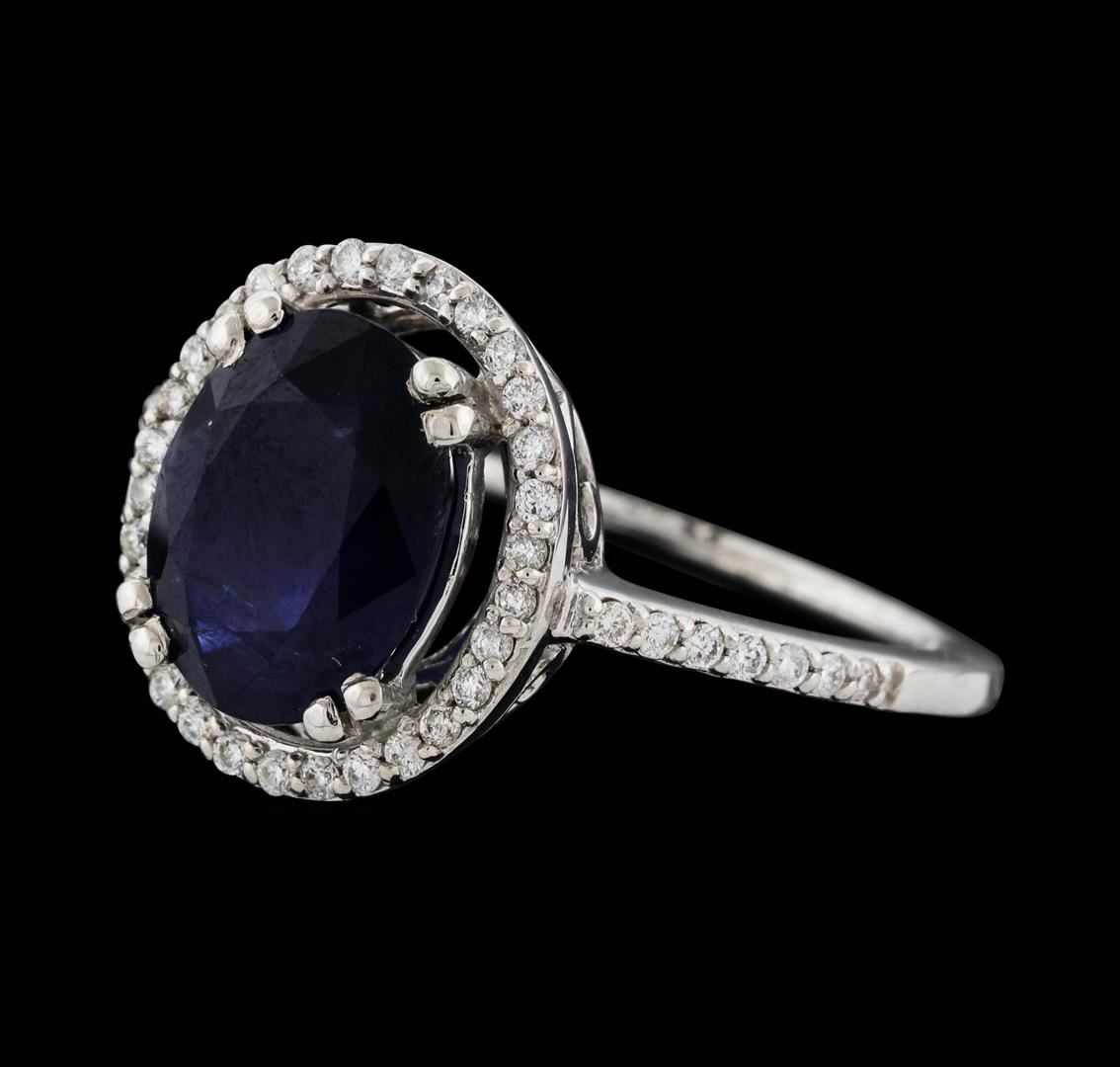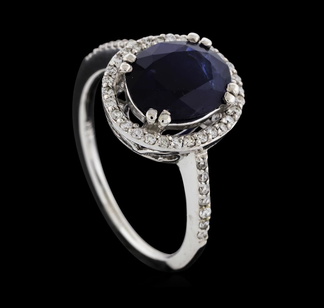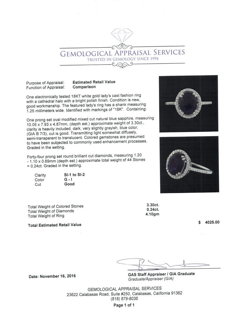 One electronically tested 18KT white gold lady's cast fashion ring with a cathedral halo with a bright polish finish. The featured lady's ring has a shank measuring 1.25 millimeters wide. Identified with markings of '18K'. Condition is new, good workmanship. Containing: One prong set oval modified mixed cut natural blue sapphire, measuring 10.05 x 7.93 x 4.87mm, (depth est.) approximate weight of 3.30ct., clarity is heavily included, dark, very slightly grayish, blue color, (GIA B 7/3), cut is good. Transmitting light somewhat diffusely, semi-transparent to translucent. Colored gemstones are presumed to have been subjected to commonly used enhancement processes. Graded in the setting. Forty-Four prong set round brilliant cut diamonds, measuring 1.20 - 1.10 x 0.69mm (depth est.) approximate total weight of 44 Stones = 0.24ct. Graded in the setting. Clarity SI-1 to SI-2. Color: G - I Cut Good. Total Weight of Colored Stones 3.30ct.. Total Weight of Diamonds 0.24ct.. Total Weight of Ring 4.10gm. GAS Appraised at $4,025.00.