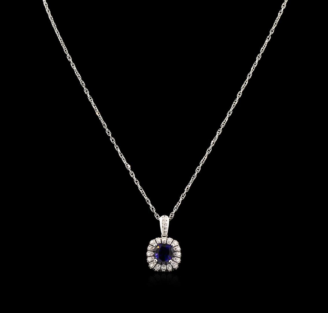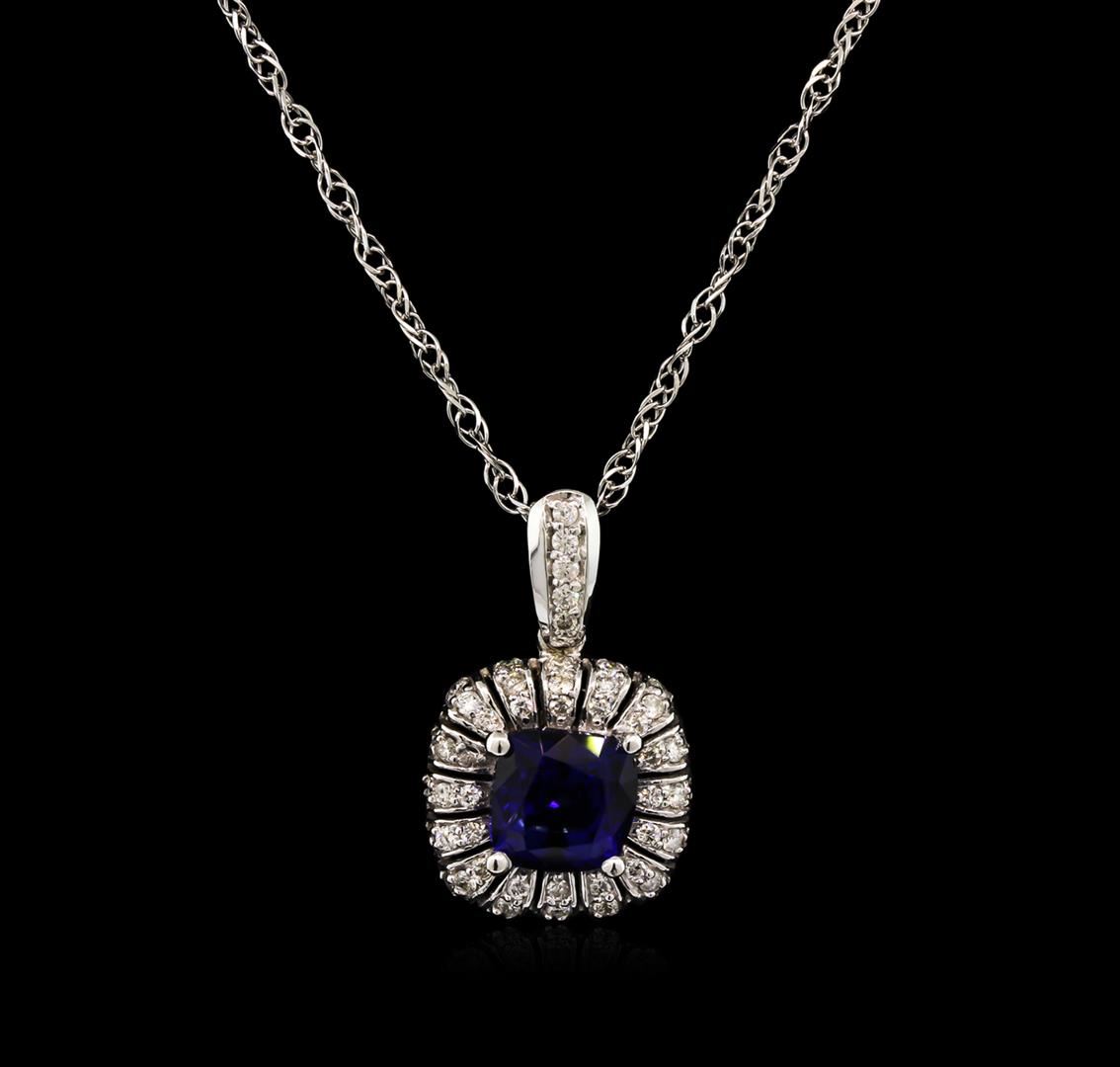 One electronically tested 14KT white gold lady's combination cast & assembled fashion pendant & chain 18.0" long, 1.75mm loose rope chain with a spring ring clasp with a cushion halo with a bright polish finish. Identified with markings of "14K". Condition is new, good workmanship. Containing: One prong set square cushion modified brilliant cut natural tanzanite, measuring 8.08 x 8.05 x 5.36mm, 20% bulge factor, approximate weight of 3.30ct., clarity is eye clean, type I, medium dark, strong, violetish blue color, (GIA vB 6/5), cut is good. Transmitting light with no distortion, transparent. Colored gemstones are presumed to have been subjected to commonly used enhancement processes. Graded in the setting. Fifty-Three prong set round brilliant cut diamonds, measuring 1.40 - 1.35 x 0.90mm (depth est.) approximate total weight of 53 Stones = 0.58ct. Graded in the setting. Clarity: SI-1 to I-1. Color: H - I. Cut Good. Total Weight of Colored Stones 3.30ct. Total Weight of Diamonds 0.58ct. Total Weight of Pendant & Chain 6.50gm. GAS Appraised at $7,340.00.