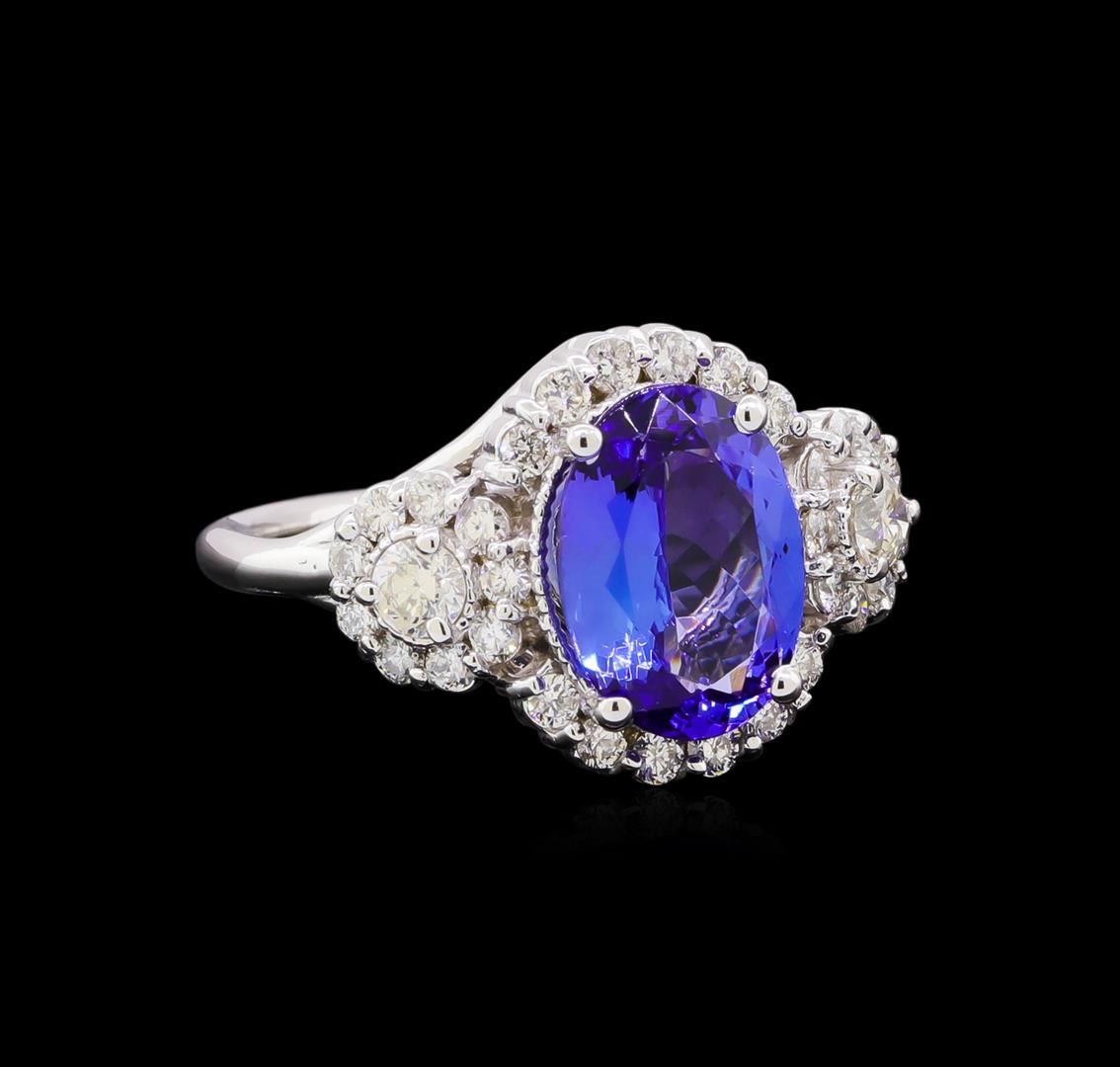 One electronically tested 14KT white gold lady's cast fashion ring with a cathedral shank with a bright polish finish. Featured lady's ring has a shank measuring 1.90 millimeters in length. Identified with markings of "14K". Condition is new, good workmanship. Containing: One prong set oval modified brilliant cut natural tanzanite, measuring 11.40 x 8.28 x 5.10mm, (depth est.) approximate weight of 3.30ct., clarity is eye clean, medium dark, moderately strong, bluish violet color, (GIA bV 6/4), cut is very good. Transmitting light with no distortion, transparent. Colored gemstones are presumed to have been subjected to commonly used enhancement processes. Graded in the setting. Two prong set round brilliant cut diamonds, measuring 3.50 - 3.45 x 2.16mm (depth est.) approximate total weight of 2 Stones = 0.30ct. Graded in the setting. Clarity: SI-1 to SI-2. Color: H - I. Cut Very Good Thirty prong set round brilliant cut diamonds, measuring 1.80 - 1.75 x 1.12mm (depth est.) approximate total weight of 30 Stones = 0.65ct. Graded in the setting. Clarity: SI-1 to SI-2. Color: G - Good. Total Weight of Colored Stones 3.30ct. Total Weight of Diamonds 0.95ct. Total Weight of Ring 6.30gm. GAS Appraised at $7,865.00.