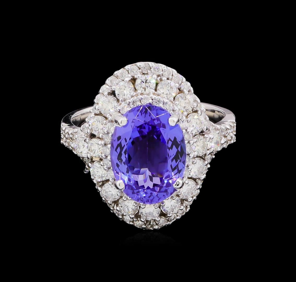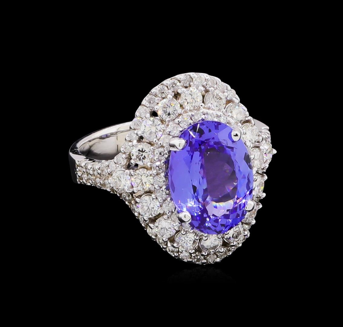 One electronically tested 14KT white gold lady's cast fashion ring with a split shank halo with a bright polish finish. The featured lady's ring has a shank measuring 3.26 millimeters wide. Identified with markings of "K14". Condition is new, good workmanship. Containing: One prong set oval modified brilliant cut natural tanzanite, measuring 10.87 x 8.24 x 4.86mm, 7%. bulge factor, approximate weight of 3.30ct., clarity is eye clean, type I, medium dark, moderately strong, violetish blue color, (GIA vB 6/4), cut is very good. Transmitting light with no distortion, transparent. Colored gemstones are presumed to have been subjected to commonly used enhancement processes. Graded in the setting. Eighteen prong set round brilliant cut diamonds, measuring 2.20 - 2.10 x 1.33mm (depth est.) approximate total weight of 18 Stones = 0.68ct. Graded in the setting. Clarity: SI-1 to SI-2. Color: H - I. Cut Good Seventy-Six prong set round brilliant cut diamonds, measuring 1.25 - 1.15 x 0.74mm (depth est.) approximate total weight of 76 Stones = 0.50ct. Graded in the setting. Clarity: SI-1 to I-1. Color: H - I. Cut Good. Total Weight of Colored Stones 3.30ct. Total Weight of Diamonds 1.18ct. Total Weight of Ring 5.80gm. GAS Appraised at $9,795.00.