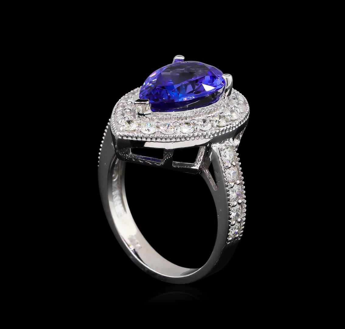 One electronically tested 14KT white gold lady's cast fashion ring with a cathedral shank with a halo with a bright polish with milgrain detailing finish. The featured lady's ring has a shank measuring 3.27 millimeters wide. Identified with markings of "K14". Condition is new, good workmanship. Containing: One prong set pear modified brilliant cut natural tanzanite, measuring 13.45 x 8.81 x 4.51mm, approximate weight of 3.30ct., clarity is eye clean, type I, medium dark, moderately strong, violetish blue color, (GIA vB 6/4), cut is very good. Transmitting light with no distortion, transparent. Colored gemstones are presumed to have been subjected to commonly used enhancement processes. Graded in the setting. Ten prong set round brilliant cut diamonds, measuring 2.30 - 2.20 x 1.35mm (depth est.) approximate total weight of 10 Stones = 0.42ct. Graded in the setting. Clarity: SI-1 to SI-2. Color: G - I. Cut Good Nineteen prong set round brilliant cut diamonds, measuring 2.10 - 2.00 x 1.23mm (depth est.) approximate total weight of 19 Stones = 0.60ct. Graded in the setting. Clarity: SI-1 to SI-2. Color: G - I. Cut Good. Total Weight of Colored Stones 3.30ct. Total Weight of Diamonds 1.02ct. Total Weight of Ring 7.10gm. GAS Appraised at $9,085.00.