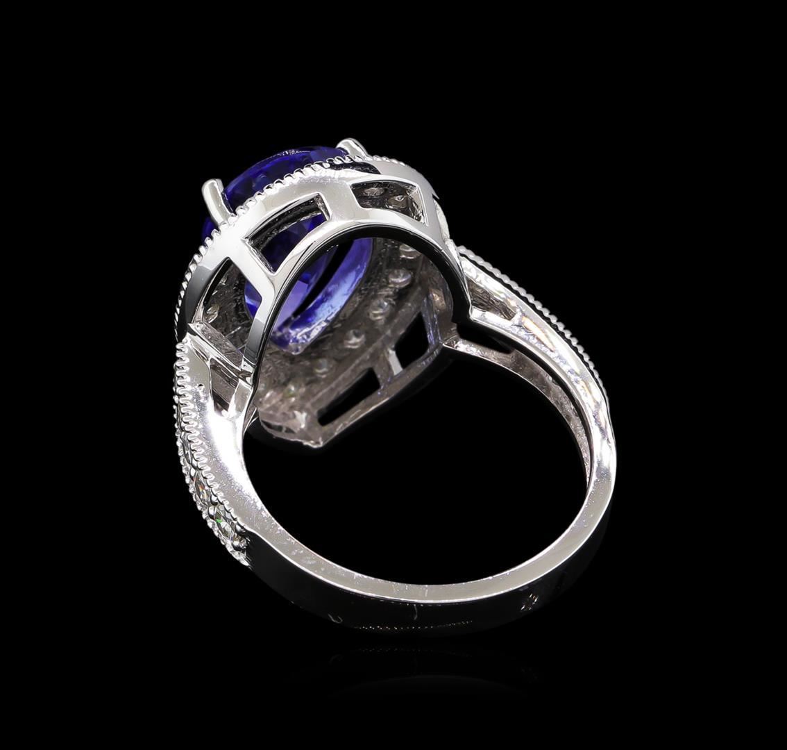 One electronically tested 14KT white gold lady's cast fashion ring with a cathedral shank with a halo with a bright polish with milgrain detailing finish. The featured lady's ring has a shank measuring 3.27 millimeters wide. Identified with markings of "K14". Condition is new, good workmanship. Containing: One prong set pear modified brilliant cut natural tanzanite, measuring 13.45 x 8.81 x 4.51mm, approximate weight of 3.30 ct., clarity is eye clean, type I, medium dark, moderately strong, violetish blue color, (GIA vB 6/4), cut is very good. Transmitting light with no distortion, transparent. Colored gemstones are presumed to have been subjected to commonly used enhancement processes. Graded in the setting. Ten prong set round brilliant cut diamonds, measuring 2.30 - 2.20 x 1.35mm (depth est.) approximate total weight of 10 Stones = 0.42ct. Graded in the setting. Clarity: SI-1 to SI-2. Color: G - I. Cut Good Nineteen prong set round brilliant cut diamonds, measuring 2.10 - 2.00 x 1.23mm (depth est.) approximate total weight of 19 Stones = 0.60 ct. Graded in the setting. Clarity: SI-1 to SI-2. Color: G - I. Cut Good. Total Weight of Colored Stones 3.30 ct. Total Weight of Diamonds 1.02ct. Total Weight of Ring 7.10gm. GAS Appraised.