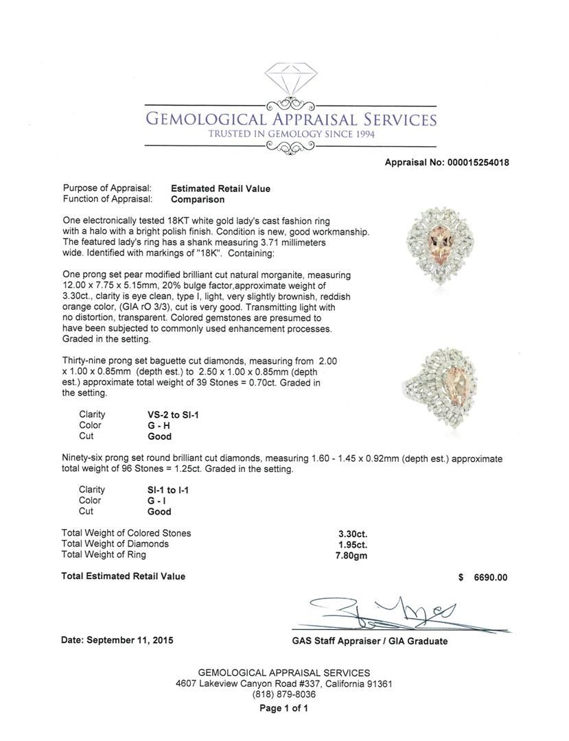 One electronically tested 18KT white gold lady's cast fashion ring with a halo with a bright polish finish. The featured lady's ring has a shank measuring 3.71 millimeters wide. Identified with markings of "18K". Condition is new, good workmanship. Containing: One prong set pear modified brilliant cut natural morganite, measuring 12.00 x 7.75 x 5.15mm, 20% bulge factor, approximate weight of 3.30ct., clarity is eye clean, type I, light, very slightly brownish, reddish orange color, (GIA rO 3/3), cut is very good. Transmitting light with no distortion, transparent. Colored gemstones are presumed to have been subjected to commonly used enhancement processes. Graded in the setting. Thirty-Nine prong set baguette cut diamonds, measuring from 2.00 x 1.00 x 0.85mm (depth est.) to 2.50 x 1.00 x 0.85mm (depth est.) approximate total weight of 39 Stones = 0.70ct. Graded in the setting. Clarity: VS-2 to SI-1. Color: G - Good Ninety-Six prong set round brilliant cut diamonds, measuring 1.60 - 1.45 x 0.92mm (depth est.) approximate total weight of 96 Stones = 1.25ct. Graded in the setting. Clarity: SI-1 to I-1. Color: G - I. Cut Good. Total Weight of Colored Stones 3.30ct. Total Weight of Diamonds 1.95ct. Total Weight of Ring 7.80gm. GAS Appraised at $6,690.00.