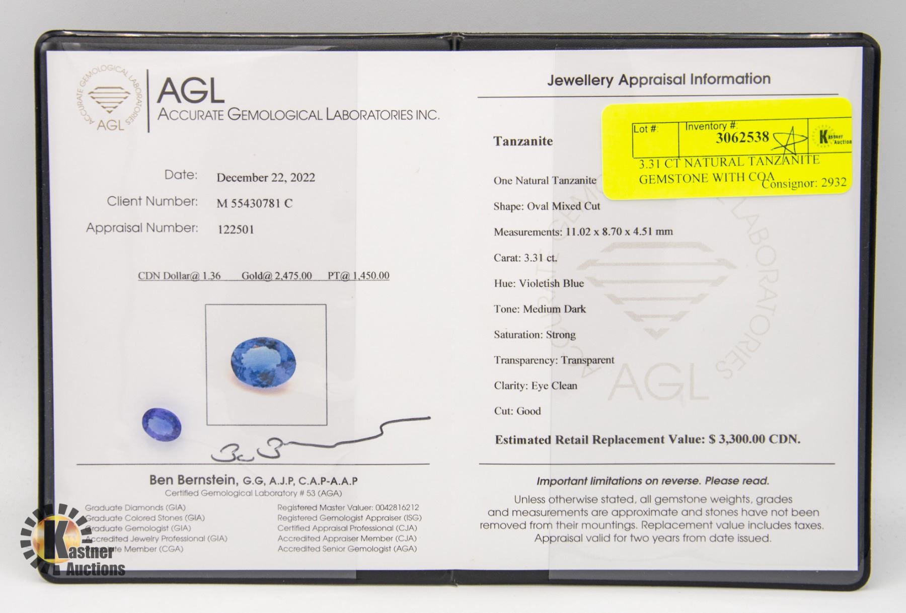 MEASURING 11.02 X 8.70 X 4.51mm, HUE IS VIOLETISH BLUE, TONE IS MEDIUM DARK, SATURATION IS STRONG, TRANSPARENT EYE CLEAN CLARITY, CUT IS GOOD. COMES WITH COA FROM AGL WITH ESTIMATED RETAIL REPLACEMENT VALUE OF $3,300.00 **ALL ITEMS MUST BE REMOVED BY 5PM SATURDAY, APRIL 8TH 2023. ALL REMAINING ITEMS WILL BE SUBJECT TO A $6.00 PER DAY STORAGE CHARGE. ANY ITEMS REMAINING AFTER MONDAY, APRIL 23RD, 2023 WILL BE CONSIDERED FORFEITED. NO REFUNDS WILL BE ISSUED FOR FORFEITED ITEMS. TO SCHEDULE A PICK UP APPOINTMENT CLICK HERE
