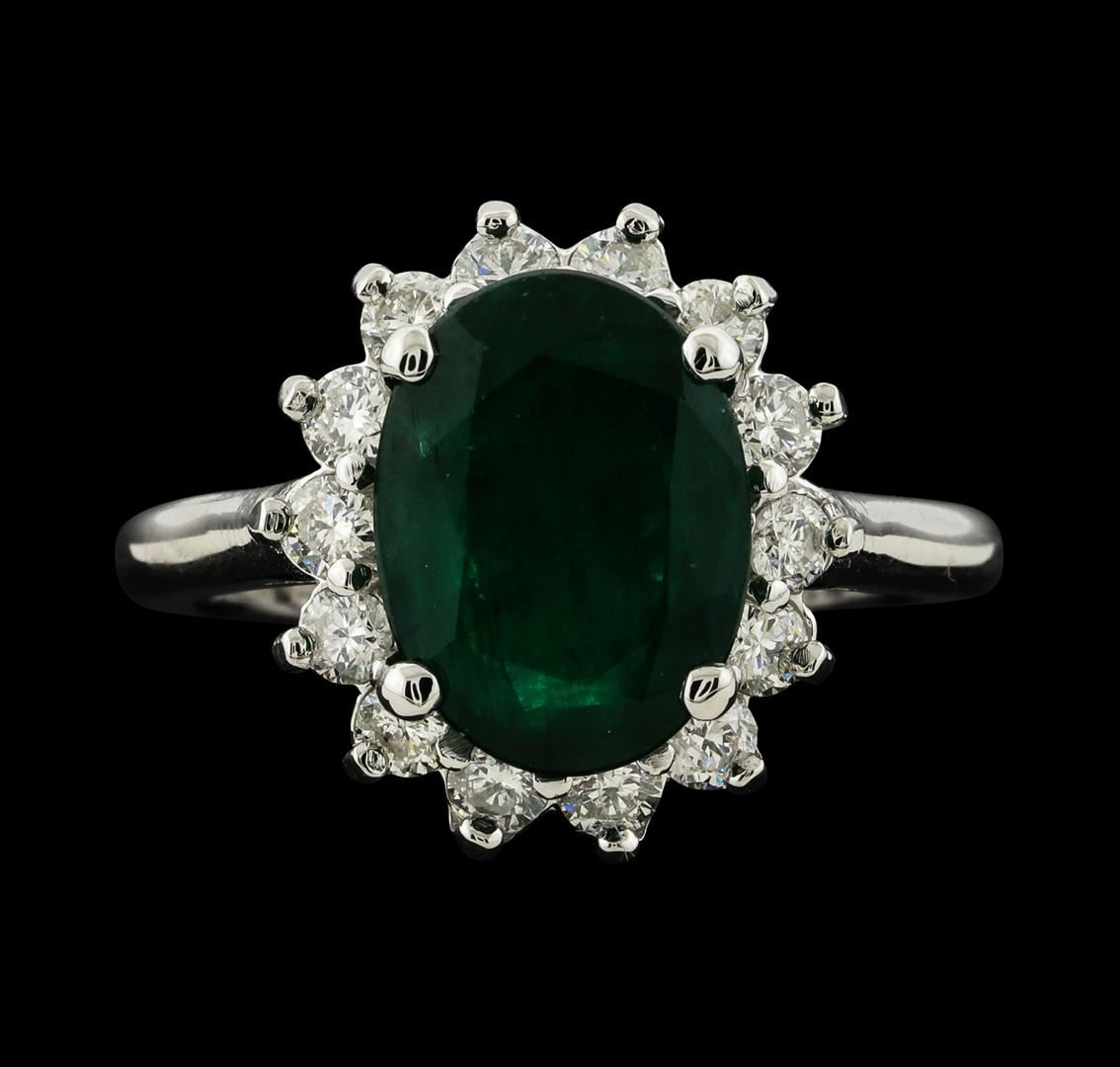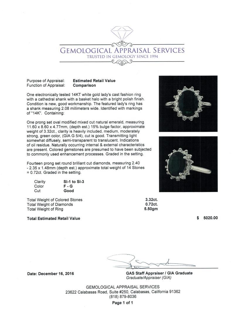 One electronically tested 14KT white gold lady's cast fashion ring with a cathedral shank with a basket halo with a bright polish finish. The featured lady's ring has a shank measuring 2.08 millimeters wide. Identified with markings of '14K'. Condition is new, good workmanship. Containing: One prong set oval modified mixed cut natural emerald, measuring 11.60 x 8.60 x 4.77mm, (depth est.) 15%. bulge factor, approximate weight of 3.32ct., clarity is heavily included, medium, moderately strong, green color, (GIA G 5/4), cut is good. Transmitting light somewhat diffusely, semi-transparent to translucent. Indications of oil residue. Naturally occurring internal & external characteristics are present. Colored gemstones are presumed to have been subjected to commonly used enhancement processes. Graded in the setting. Fourteen prong set round brilliant cut diamonds, measuring 2.40 - 2.35 x 1.48mm (depth est.) approximate total weight of 14 Stones = 0.72ct. Graded in the setting. Clarity SI-1 to SI-3. Color: F - G Cut Good. Total Weight of Colored Stones 3.32ct.. Total Weight of Diamonds 0.72ct.. Total Weight of Ring 5.50gm. GAS Appraised.