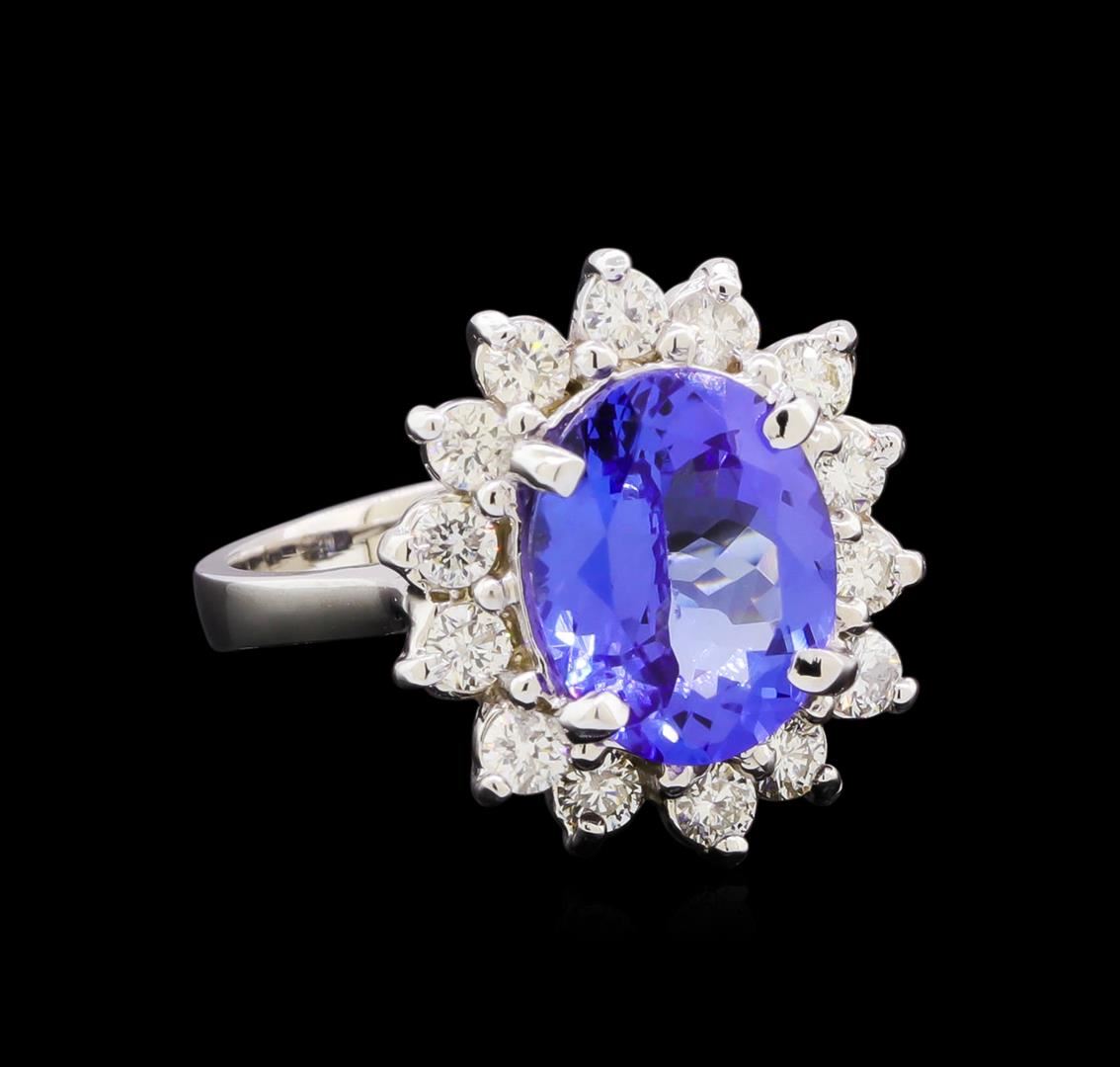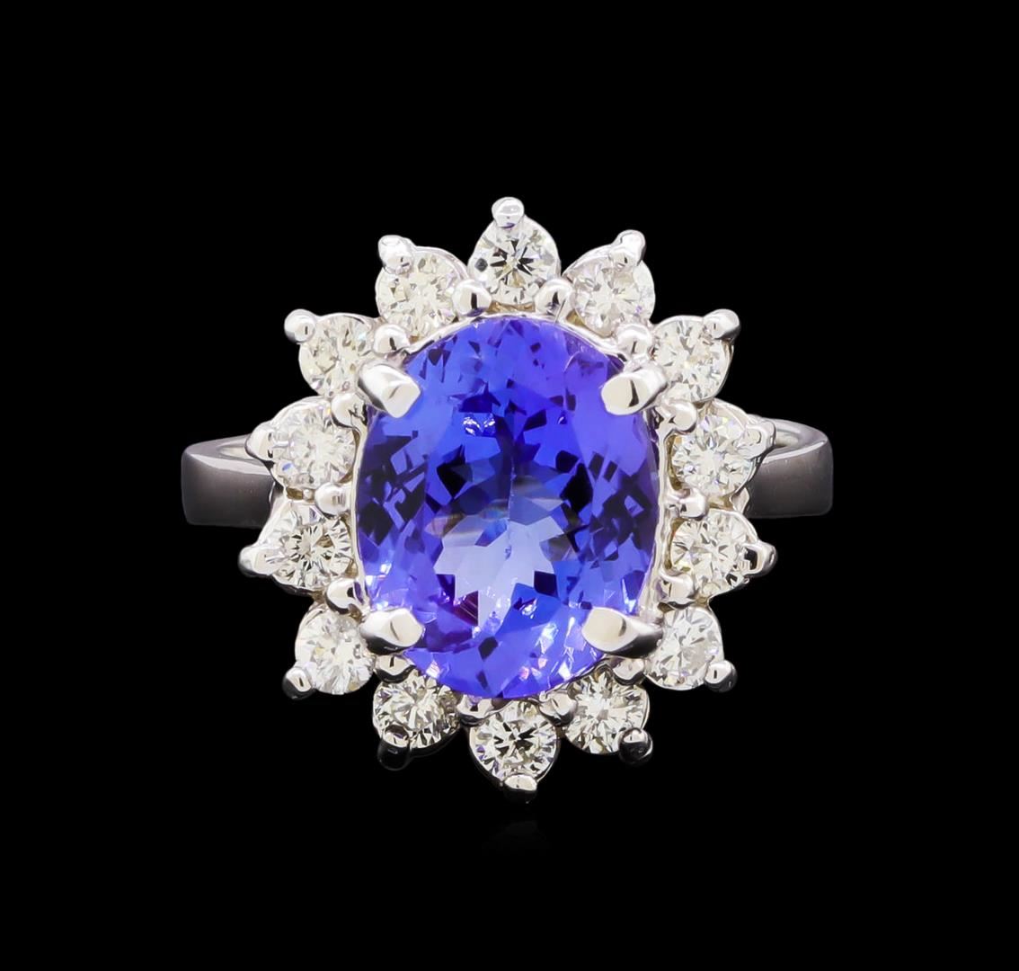 One electronically tested 14KT white gold lady's cast fashion ring with a basket halo with a bright polish finish. The featured lady's ring has a shank measuring 2.55 millimeters in width. Identified with markings of "K14". Condition is new, good workmanship. Containing: One prong set oval modified brilliant cut natural tanzanite, measuring 10.75 x 8.51 x 5.08mm, (depth est.) 3%. bulge factor, approximate weight of 3.32ct., clarity is eye clean, medium dark, moderately strong, violetish blue color, (GIA vB 6/4), cut is very good. Transmitting light with no distortion, transparent. Colored gemstones are presumed to have been subjected to commonly used enhancement processes. Graded in the setting. Fourteen prong set round brilliant cut diamonds, measuring 2.50 - 2.35 x 1.48mm (depth est.) approximate total weight of 14 Stones = 0.70ct. Graded in the setting. Clarity: SI-1 to SI-2. Color: H - I. Cut Good. Total Weight of Colored Stones 3.32ct. Total Weight of Diamonds 0.70ct. Total Weight of Ring 5.90gm. GAS Appraised at $8,180.00.