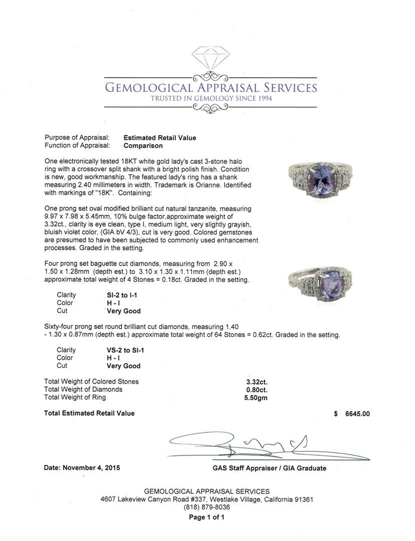 One electronically tested 18KT white gold lady's cast 3-stone halo ring with a crossover split shank with a bright polish finish. The featured lady's ring has a shank measuring 2.40 millimeters in width. Trademark is Orianne. Identified with markings of "18K". Condition is new, good workmanship. Containing: One prong set oval modified brilliant cut natural tanzanite, measuring 9.97 x 7.98 x 5.45mm, 10% bulge factor, approximate weight of 3.32ct., clarity is eye clean, type I, medium light, very slightly grayish, bluish violet color, (GIA bV 4/3), cut is very good. Colored gemstones are presumed to have been subjected to commonly used enhancement processes. Graded in the setting. Four prong set baguette cut diamonds, measuring from 2.90 x 1.50 x 1.28mm (depth est.) to 3.10 x 1.30 x 1.11mm (depth est.) approximate total weight of 4 Stones = 0.18ct. Graded in the setting. Clarity: SI-2 to I-1. Color: H - I. Cut Very Good Sixty-Four prong set round brilliant cut diamonds, measuring 1.40 - 1.30 x 0.87mm (depth est.) approximate total weight of 64 Stones = 0.62ct. Graded in the setting. Clarity: VS-2 to SI-1. Color: H - I. Cut Very Good. Total Weight of Colored Stones 3.32ct. Total Weight of Diamonds 0.80ct. Total Weight of Ring 5.50gm GAS Appraised at $6,645.00.