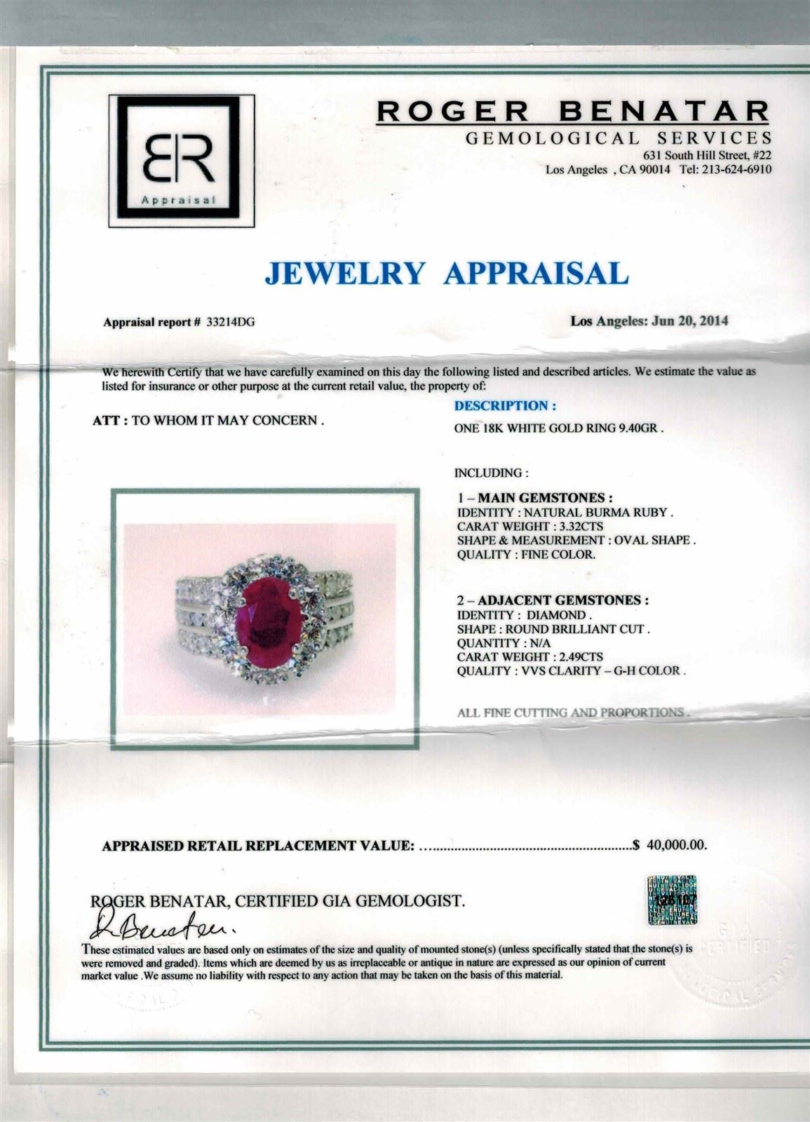 18K WHITE GOLD RUBY RING:9.40GRAM /DIAMOND RD:2.49CT/RUBY:3.32CT NO GLASS FILLED AND BURMA/#GVR1238/ NO LEAD OR GLASS FILLING **This stunning 3.32ct oval shape Natural Burma Ruby steals the breath with the pure awe of its deep red hue. Rubies impart a feeling of power to the wearer, improving self confidence and adventurousness. Surrounded by twinkling 2.49ct Round Cut Diamonds and set in a warm 14k white gold it is sure to rouse thoughts of timeless glamour and grace. this cocktail ring is a secure purchase.**