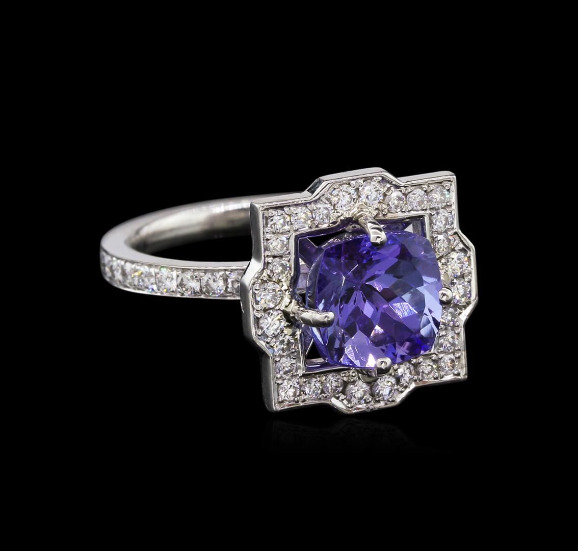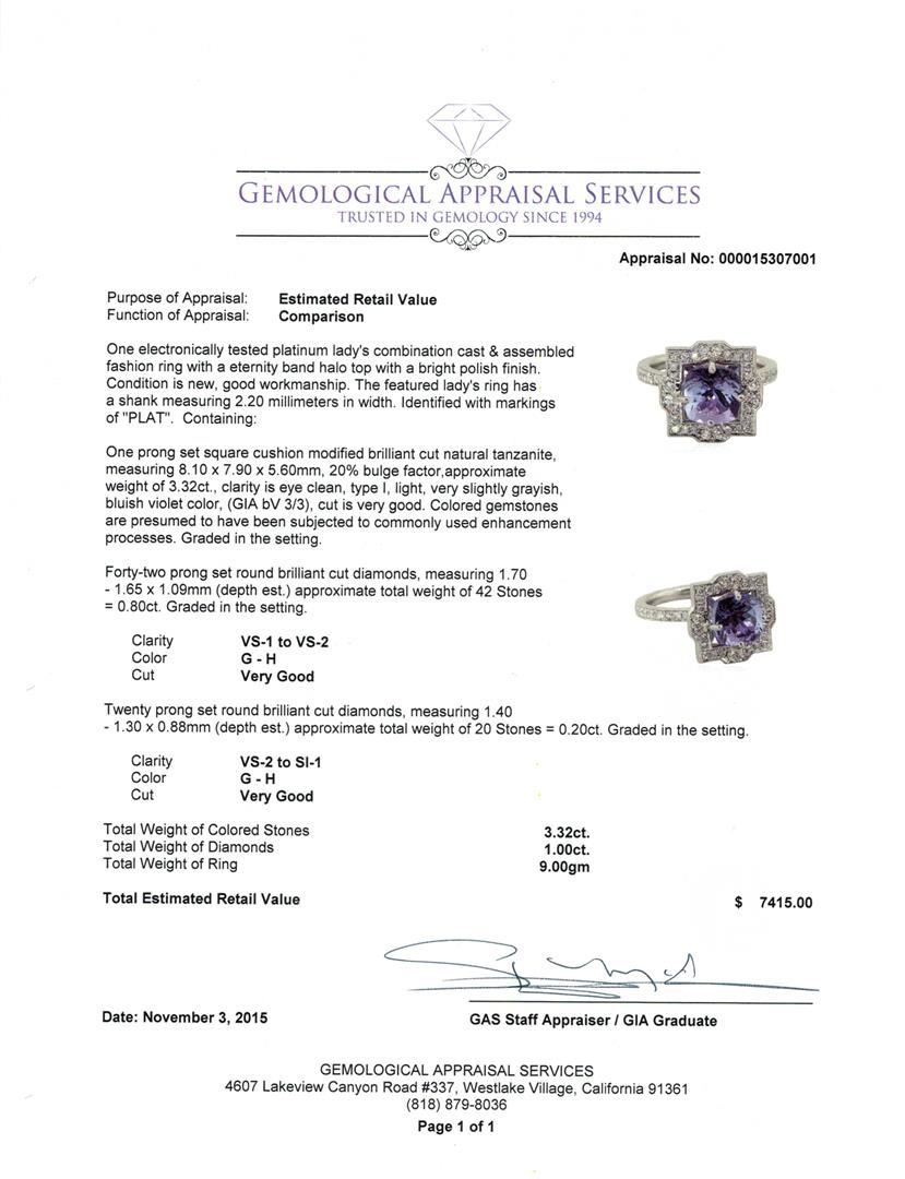 One electronically tested platinum lady's combination cast & assembled fashion ring with a eternity band halo top with a bright polish finish. The featured lady's ring has a shank measuring 2.20 millimeters in width. Identified with markings of "PLAT". Condition is new, good workmanship. Containing: One prong set square cushion modified brilliant cut natural tanzanite, measuring 8.10 x 7.90 x 5.60mm, 20% bulge factor, approximate weight of 3.32ct., clarity is eye clean, type I, light, very slightly grayish, bluish violet color, (GIA bV 3/3), cut is very good. Colored gemstones are presumed to have been subjected to commonly used enhancement processes. Graded in the setting. Forty-Two prong set round brilliant cut diamonds, measuring 1.70 - 1.65 x 1.09mm (depth est.) approximate total weight of 42 Stones = 0.80ct. Graded in the setting. Clarity: VS-1 to VS-2. Color: G - Very Good Twenty prong set round brilliant cut diamonds, measuring 1.40 - 1.30 x 0.88mm (depth est.) approximate total weight of 20 Stones = 0.20ct. Graded in the setting. Clarity: VS-2 to SI-1. Color: G - Very Good. Total Weight of Colored Stones 3.32ct. Total Weight of Diamonds 1.00ct. Total Weight of Ring 9.00gm GAS Appraised at $7,415.00.