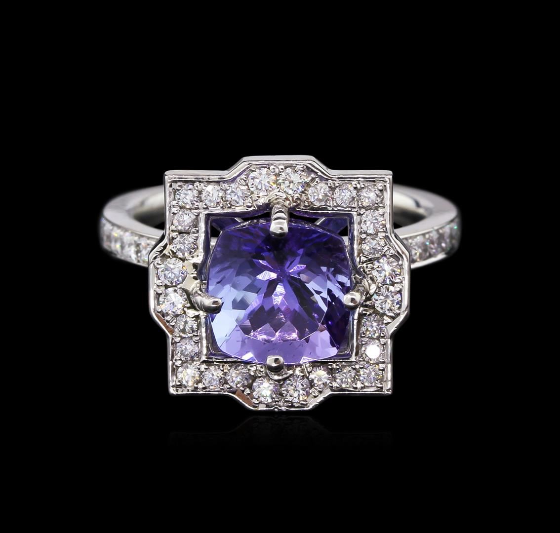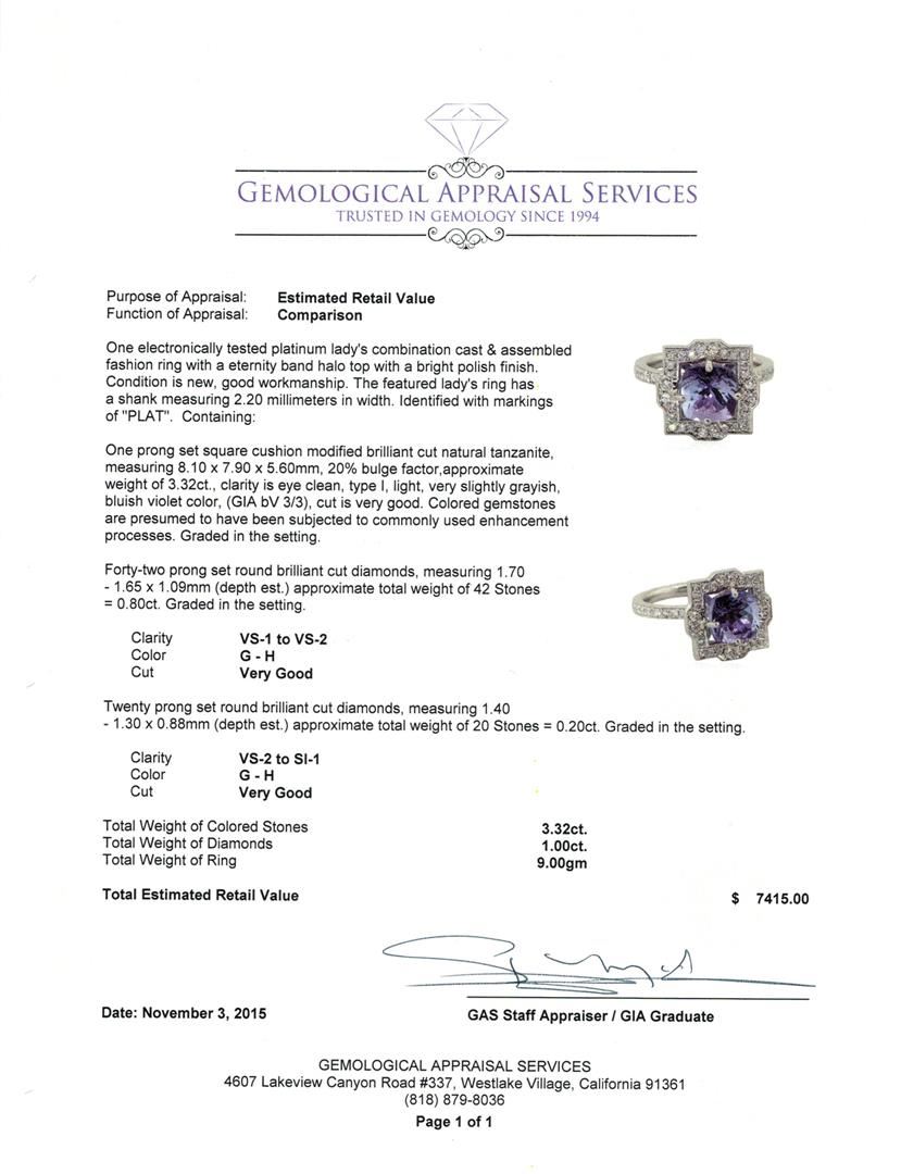 One electronically tested platinum lady's combination cast & assembled fashion ring with a eternity band halo top with a bright polish finish. The featured lady's ring has a shank measuring 2.20 millimeters in width. Identified with markings of "PLAT". Condition is new, good workmanship. Containing: One prong set square cushion modified brilliant cut natural tanzanite, measuring 8.10 x 7.90 x 5.60mm, 20% bulge factor, approximate weight of 3.32ct., clarity is eye clean, type I, light, very slightly grayish, bluish violet color, (GIA bV 3/3), cut is very good. Colored gemstones are presumed to have been subjected to commonly used enhancement processes. Graded in the setting. Forty-Two prong set round brilliant cut diamonds, measuring 1.70 - 1.65 x 1.09mm (depth est.) approximate total weight of 42 Stones = 0.80ct. Graded in the setting. Clarity: VS-1 to VS-2. Color: G - Very Good Twenty prong set round brilliant cut diamonds, measuring 1.40 - 1.30 x 0.88mm (depth est.) approximate total weight of 20 Stones = 0.20ct. Graded in the setting. Clarity: VS-2 to SI-1. Color: G - Very Good. Total Weight of Colored Stones 3.32ct. Total Weight of Diamonds 1.00ct. Total Weight of Ring 9.00gm GAS Appraised at $7,415.00.