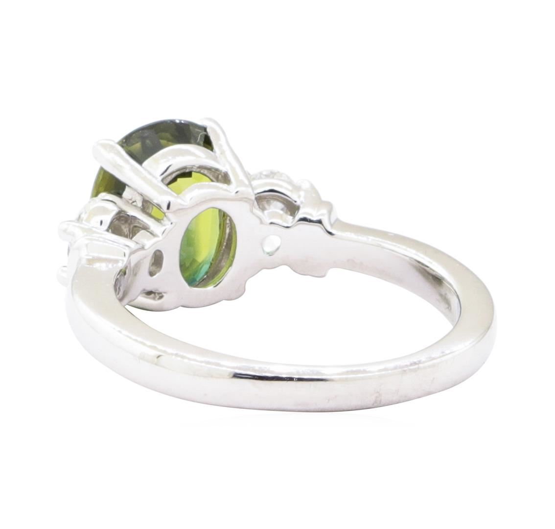 One electronically tested platinum lady's cast fashion ring with a three stone motif with a bright polish finish. The featured lady's ring has a shank measuring 2.30 millimeters wide. Identified with markings of 'PT 950'. Condition is new, good workmanship. Containing: One prong set oval modified mixed cut natural green tourmaline, measuring 9.86 x 7.86 x 4.50mm, (depth est.) 20%. bulge factor, approximate weight of 2.88ct., clarity is eye clean, medium, moderately strong, yellowish green color, (GIA yG 5/4), cut is good. Transmitting light with no distortion, transparent. Colored gemstones are presumed to have been subjected to commonly used enhancement processes. Graded in the setting. Two prong set oval shaped cut diamonds, measuring 4.70 x 3.70 x 2.25mm (depth est.) approximate total weight of 2 Stones = 0.45ct. Graded in the setting. Color G - H Clarity VS-2 to SI-1 Cut Very Good. Total Weight of Colored Stones 2.88ct.. Total Weight of Diamonds 0.45ct.. Total Weight of Ring 8.00gm GAS Appraised at $4630.00. GAS Appraised at $4,630.00.