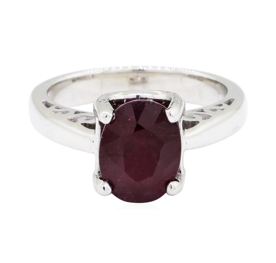 One electronically tested 18KT white gold lady's cast fashion ring with a bright polish finish. The featured lady's ring has a shank measuring 3.10 millimeters wide. Identified with markings of '18K'. Condition is new, good workmanship. Containing: One prong set oval modified mixed cut natural ruby, measuring 9.21 x 7.20 x 5.20mm, (depth est.) 15%. bulge factor, approximate weight of 3.33ct., clarity is heavily included, medium dark, very slightly brownish, red color, (GIA R 6/3), cut is good. Transmitting light somewhat diffusely, semi-transparent to translucent. Naturally occurring internal & external characteristics are present. Colored gemstones are presumed to have been subjected to commonly used enhancement processes. Graded in the setting. Total Weight of Colored Stones 3.33ct.. Total Weight of Ring 6.50gm GAS Appraised at $2520.00. GAS Appraised.