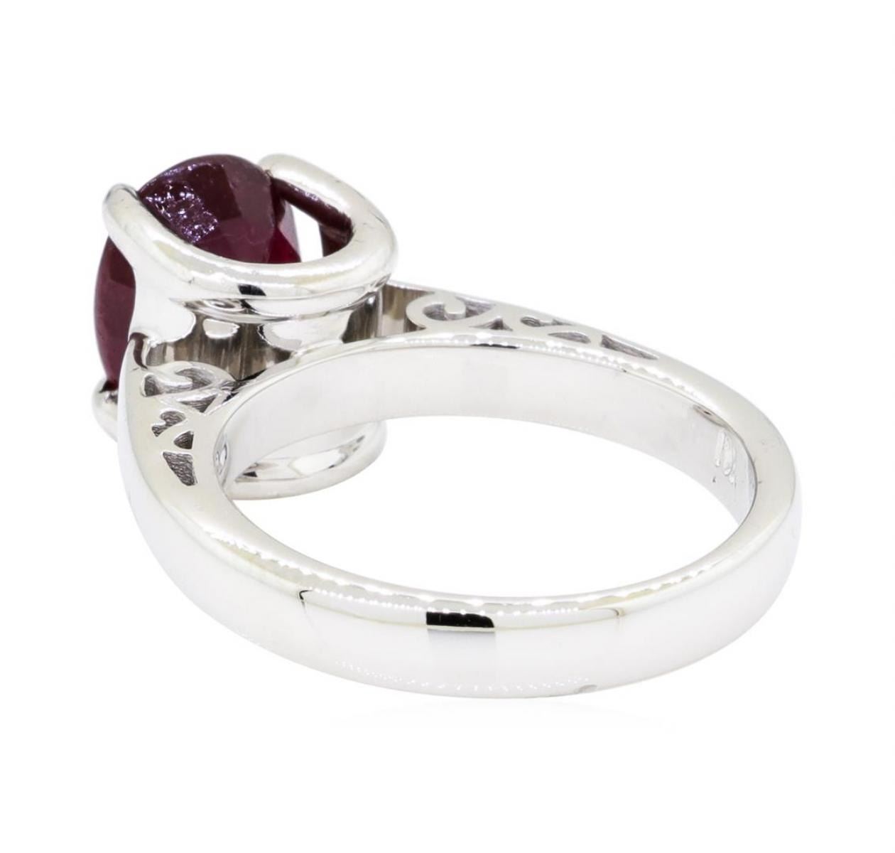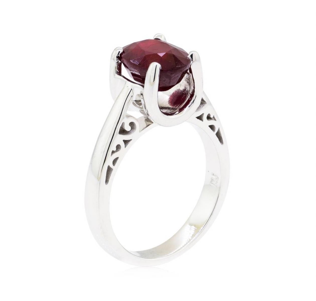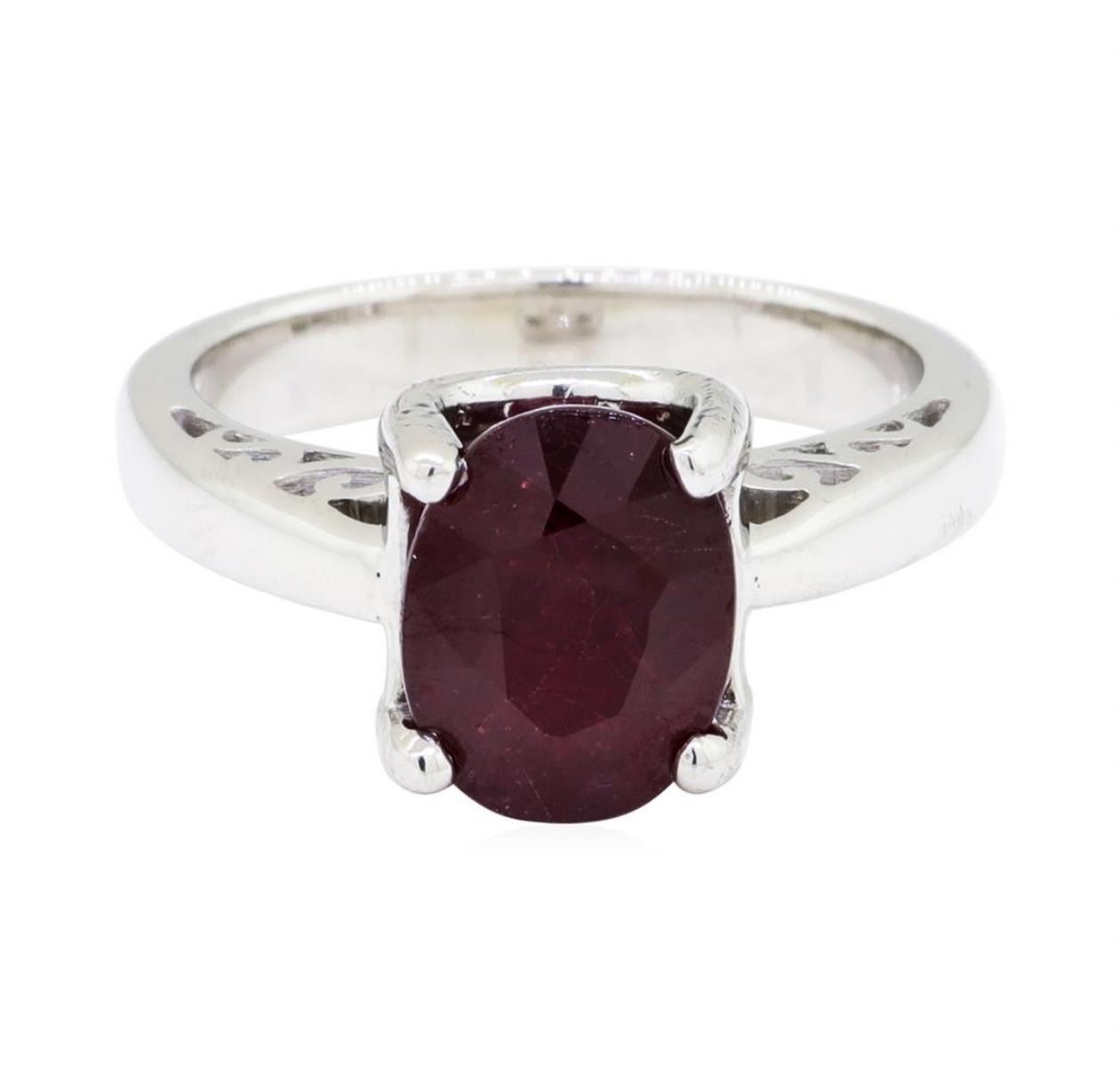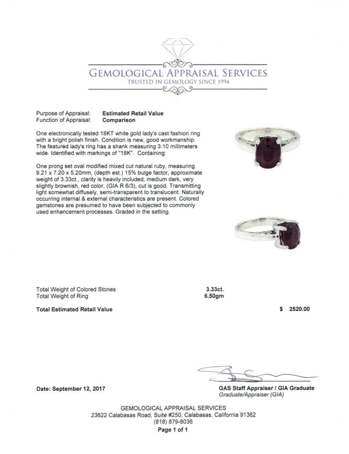 One electronically tested 18KT white gold lady's cast fashion ring with a bright polish finish. The featured lady's ring has a shank measuring 3.10 millimeters wide. Identified with markings of '18K'. Condition is new, good workmanship. Containing: One prong set oval modified mixed cut natural ruby, measuring 9.21 x 7.20 x 5.20mm, (depth est.) 15%. bulge factor, approximate weight of 3.33ct., clarity is heavily included, medium dark, very slightly brownish, red color, (GIA R 6/3), cut is good. Transmitting light somewhat diffusely, semi-transparent to translucent. Naturally occurring internal & external characteristics are present. Colored gemstones are presumed to have been subjected to commonly used enhancement processes. Graded in the setting. Total Weight of Colored Stones 3.33ct.. Total Weight of Ring 6.50gm GAS Appraised at $2520.00. GAS Appraised.